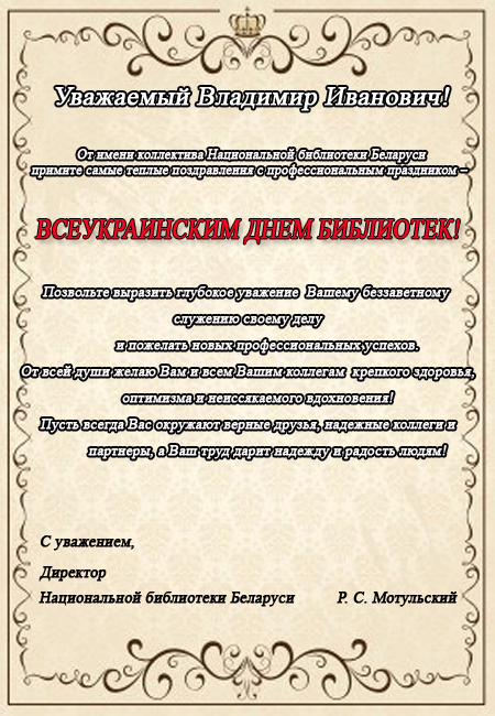 Бажаю вам творчого завзяття, нових успіхів у благородній праці на теренах розбудови української науки, освіти, культури і духовності, неодмінного зростання читацького попиту на книгу, інформацію, посилення авторитету бібліотечної справи в суспільстві.