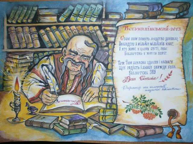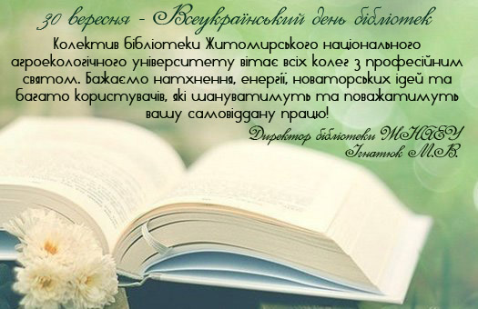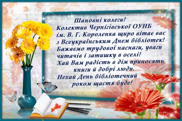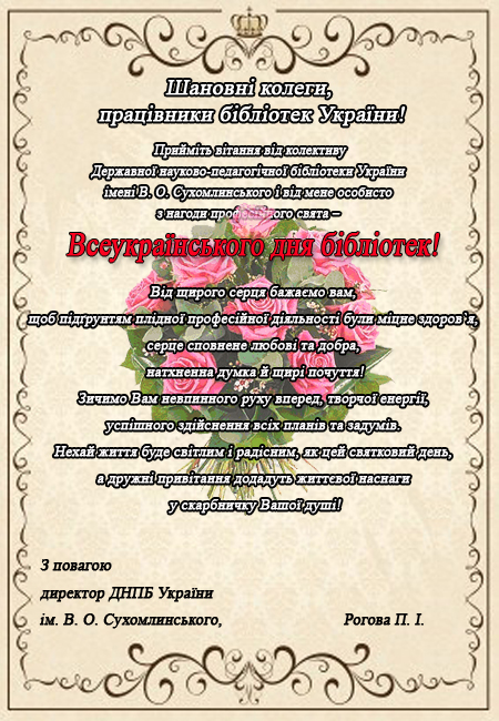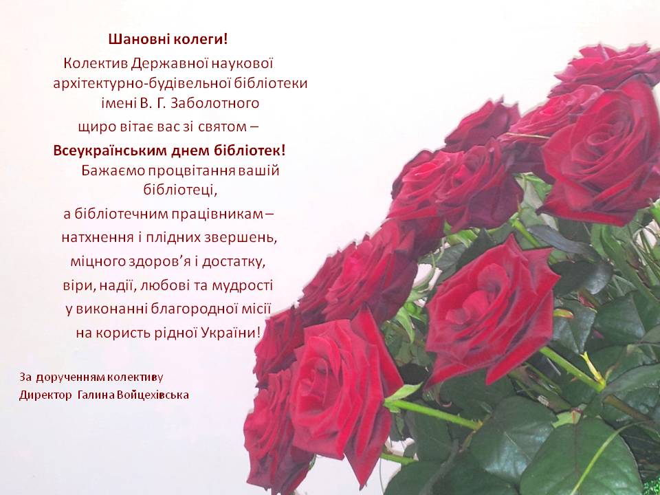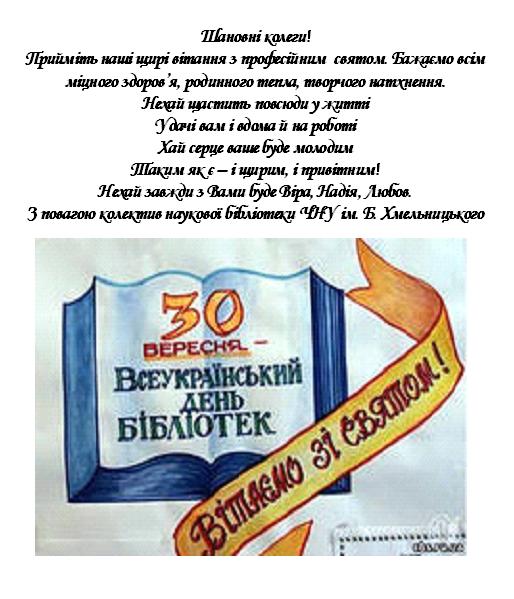 Від імені президії Асоціації бібліотек України, колективу Національної бібліотеки України імені В. І. Вернадського щиро вітаю вас з професійним святом духовності, мудрості і знань – Всеукраїнським днем бібліотек!
