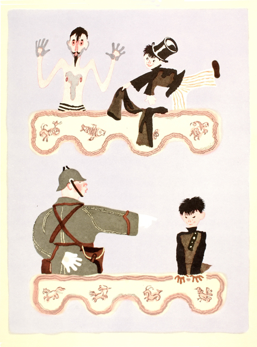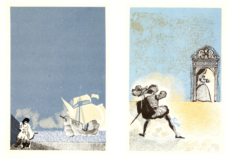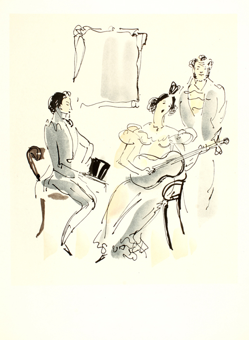 На виставці книжкова графіка 1920-х років представлена блискучими ілюстраціями Юрія Анненкова «Катька» до поеми О. Блока «Дванадцять» (1918), Олександра Бенуа до поеми О. С. Пушкіна «Мідний вершник» (1921), Володимира Лебедєва до книги С. Маршака «Морозиво» (1920), Ель Лисицького до поезії В. Маяковського «Лівий марш» (1923), Дмитра Митрохіна до поеми-казки М. Цвєтаєвої «Цар-дівиця» (1922), виконаних у різних техніках та індивідуальних манерах. Чудові зразки художнього оздоблення книги періоду 1930-х рр. на виставці представлені ксилографіями Олексія Кравченка до творів А. Франса «Злочин Сильвестра Боннара» (1831) та «Єгипетські ночі О. Пушкіна» (1934), малюнком аквареллю і тушшю Миколи Кузьмина до поеми «Євгеній Онєгін» О. Пушкіна (1933), кольоровими ксилографіями Володимира Фаворського до книги С. Маршака «Сім чудес» (1929) та Геннадія Єпіфанова до «Повчальні новели» М. Сервантеса (1933), суперобкладинкою Андрія Гончарова до «Творів Мольєра» (1933), ксилографіями Георгія Єчеїстова до поеми Г. Гейне «Атта Тролль» (1935), літографіями Євгена Кибрика до «Легенди про Уленшпігеля» Ш. де Костера (1938) та роману «Зачарована душа» Р. Роллана (1940–1941), Володимира Конашевича до повісті абата Прево «Манон Леско» (1931). Сорокові – п‘ятдесяті в експозиції представлені також і художниками нового покоління, талановиті твори яких вже давно стали класикою російського та європейського мистецтва. Відвідувачі виставки мають можливість побачити рисунок Беньяміна Басова «Дуель Пушкіна» до книги І. Андроникова «Останні дні Пушкіна» (1957), акварельні ілюстрації Віталія Горяєва до повісті Ю. Олеші «Три товстуни» (1948), кольорову гравюру на дереві Володимира Домогацького «Старий дім» до казки Г. Х. Андерсена (1946), ксилографію Федора Константинова до «Ромео і Джульєтта» В. Шекспіра. Усі твори представлені на виставці високоякісними факсимільними репродукціями, які максимально точно відтворюють їх оригінали.
