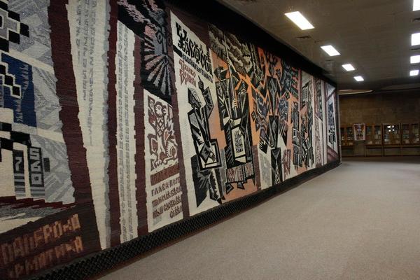 Фойє перед читальними залами прикрашає гобелен-триптих «Витоки слов’янської писемності» (автори М. Т. Литовченко та І. С. Литовченко, розмір 7×3,5 м), виконаний у техніці ручного ткацтва. Матеріали – вовна, люрекс. Композиційне рішення гобелена обумовлене наявністю колон, які не дозволяють сприйняти всю площу полотна одночасно. У центральній частині на фоні яскравого вогню зображені язичницькі символи, які уособлюють образи створення світу та зародження писемності. На зміну символічним образам приходять конкретні: київський літописець та письменник Нестор, творці слов’янської азбуки Кирило і Мефодій, лексикограф, письменник і гравер Памво Беринда – автор першого друкованого українського словника, український і російський першодрукар Іван Федоров, політичний і освітній діяч України митрополит київський Петро Могила. Ліва та права частини триптиху присвячені еволюції засобів писемності в умовах інформатизації суспільства. Автори обох названих вище робіт 1998 р. стали лауреатами Національної премії України імені Тараса Шевченка.