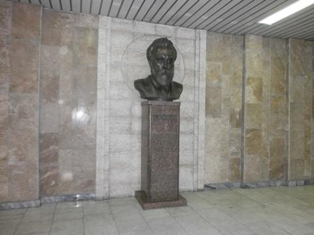 Уздовж пандусу (пологих сходів), що з’єднує перший і другий поверхи Бібліотеки, встановлені 11 мармурових бюстів видатних діячів, які зробили значний внесок у розвиток світової науки і культури: Ярослав Мудрий, Іван Федоров, Михайло Ломоносов, Григорій Сковорода, Микола Лобачевський, Олександр Пушкін, Тарас Шевченко, Дмитро Менделєєв, Ілля Мечников, Костянтин Ціолковський та Олександр Попов.