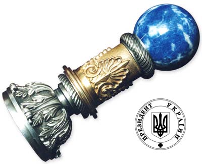 Рукоятка президентської печатки прикрашена лазуритовою кулею, яка, завдяки фактурі каменя, на вигляд нагадує знімок Землі з космосу. Тубус печатки позолочений, тому за кольоровою гамою вона відповідає національному прапору України: блакитний верх і жовтий низ. Виготовлена печатка зі срібла і важить майже 500 г. Її виготовив за тиждень київський ювелір Михайло Чебурахін.