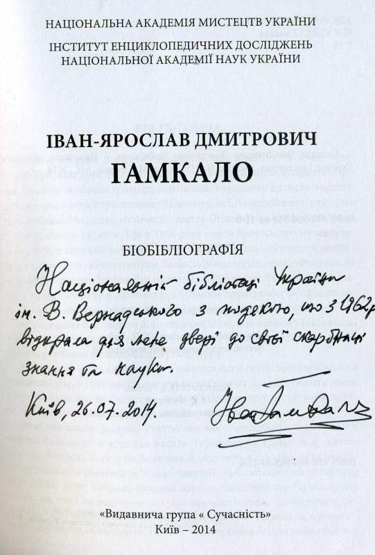 Іван-Ярослав Дмитрович Гамкало : біобібліогр. / Нац. акад. мистецтв України, Ін-т енцикл. дослідж. НАНУ ; уклад. М. Гамкало. – Київ : Видавн. група «Сучасність», 2014. – 200 с.