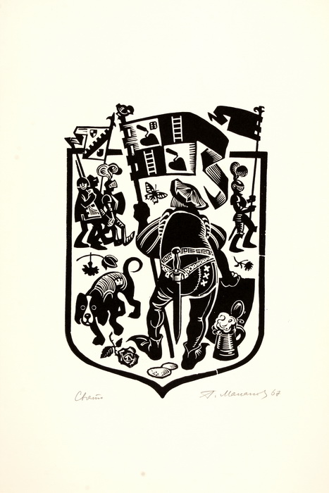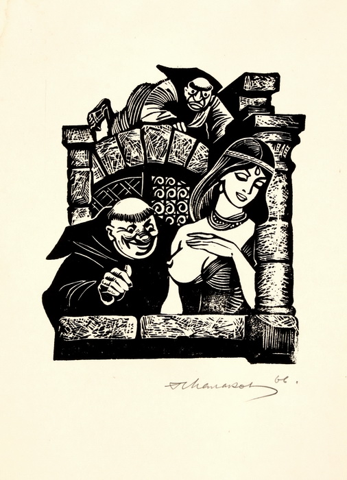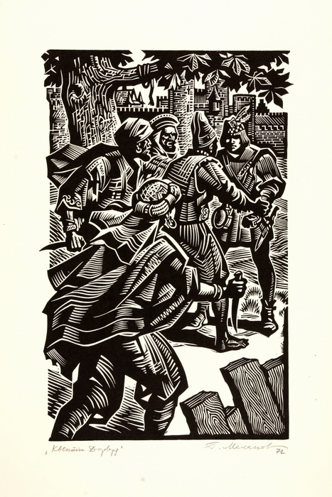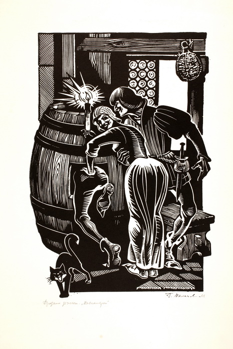 11 ліноритів та 3 малюнки (титул, заставка та ескіз) – ілюстрації до новел Дж. Бокаччо «Декамерон» («Крізь замкову шпарину», «Садівник Мазетто», «У келії», «Втеча», «Дівчина і ченці», «Їж, пий, веселись», «Монах і абат», «Пограбування Рінальдо Д`Есті», «Покарання Спінеллоччо», «Продаж діжки»); Ілюстрації «Корчма» і «Маркитанки» до роману Ш. де Костера «Легенда про Тіля Уленшпігеля і Ламме Гудзака»; 8 ліноритів – ілюстрації до роману В. Скотта «Квентін Дорвард» («Бій з Арденським Вепрем», «Вигнання», «Лист для графині Ізабели», «Нічний похід», «Прелат перед Арденським Вепрем», «Сутичка з гасконцем», «Сутичка з магом», «У каплиці»); ілюстрація «Дарунок королю» до казки Ш. Перо «Кіт у чоботях»; 3 кольорові лінорити до казки братів Грімм «Бременські музики» («Звірі вечеряють», «Звірі вломлюються до кімнати», «Ходімо з нами, півню!»); заставка до роману К. Кудієвського «Пісня синіх морів»; титул до роману А. Шаміссо «Дивні пригоди Петера Шлеміля»; ілюстрація до повісті О. Бердника «Сини Світовида».