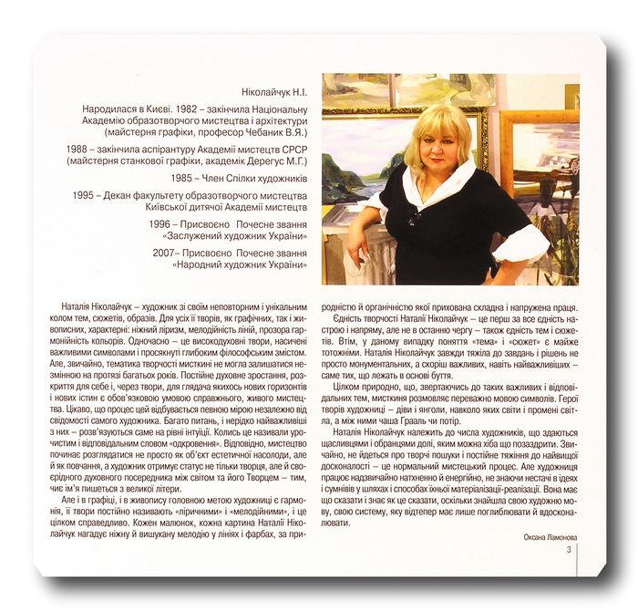 Декан факультету образотворчого мистецтва Київської дитячої Академії мистецтв Наталя Іванівна Ніколайчук перередала в дарунок для Національної бібліотеки два каталоги виставок власних графічних та живописних робіт, а також ряд видань, що презентують художні роботи юних студентів Академії: каталоги виставок «Сад мистецтв» та «Барви сонця», які проходили у київській галереї мистецтв «Лавра»; каталог мистецьких творів за темою «Мій Гоголь»; альбом малюнків дітей 5–16 років на тему природи Світового океану; календар на 2012 рік, ілюстрований малюнками учнів Академії, створений у партнерстві з «Надра-банком» та Всеукраїнським благодійним фондом «Дитячий світ».