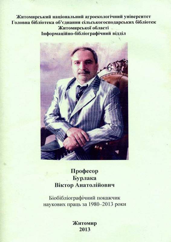 1. Бурлака Віктор Анатолійович : біобібліогр. покажч. наук. пр. за 1980 – 2013 роки / уклад. : Н. Г. Яремчук, О. І. Касянюк ; авт. вступ. ст. Е. О. Горєва-Слидзюк ; Житомир. нац. агроекол. ун-т, Бібліотека. Довідково-бібліогр. від. – Житомир, 2013. – 59 с.