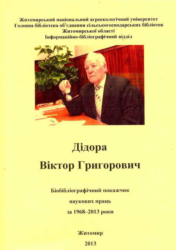 2. Дідора Віктор Григорович : біобібліогр. покажч. наук. пр. за 1968 – 2013 роки / уклад. : Н. Г. Яремчук, О. І. Касянюк ; авт. вступ. ст. Е. О. Горєва-Слидзюк ; Житомир. нац. агроекол. ун-т, Бібліотека. Довідково-бібліогр. від. – Житомир, 2013. – 36 с.