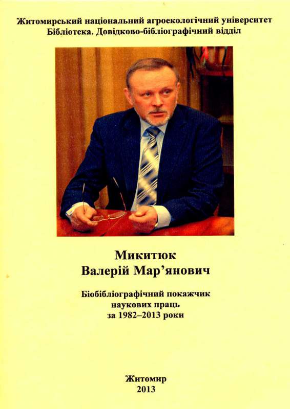 3. Микитюк Валерій Мар’янович : біобібліогр. покажч. наук. пр. за 1982 – 2013 роки / уклад. : Н. Г. Яремчук, О. І. Касянюк ; авт. вступ. ст. Е. О. Горєва-Слидзюк ; ред. та відп. за вип. М. В. Ігнатюк ; Житомир. нац. агроекол. ун-т, Бібліотека. Довідково-бібліогр. від. – Житомир, 2013. – 44 с.