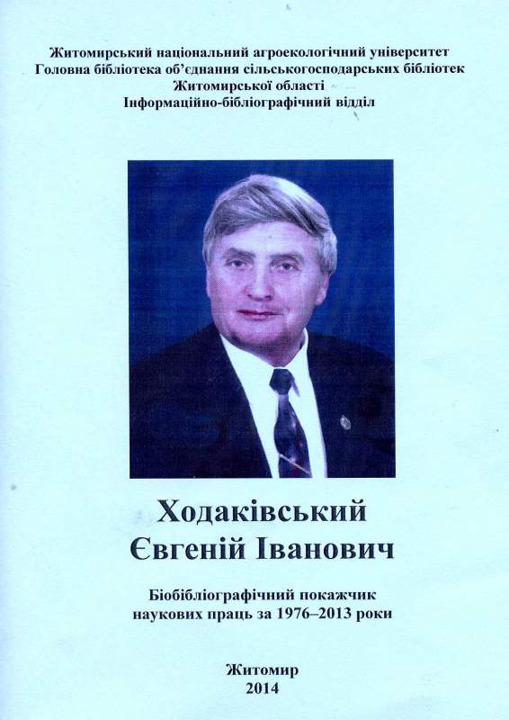 5. Ходаківський Євгеній Іванович : біобібліогр. покажч. наук. пр. за 1976 – 2013 роки / уклад. Н. Г. Яремчук, О. І. Касянюк ; авт. вступ. ст. Є. І. Ходаківський ; ред. та відп. за вип. М. В. Ігнатюк ; Житомир. нац. агроекол. ун-т, Головна бібліотека об’єднання с.-г. б-к Житомир. обл. Інформ.-бібліогр. від. – Житомир, 2014. – 39 с. – Рос., укр.
