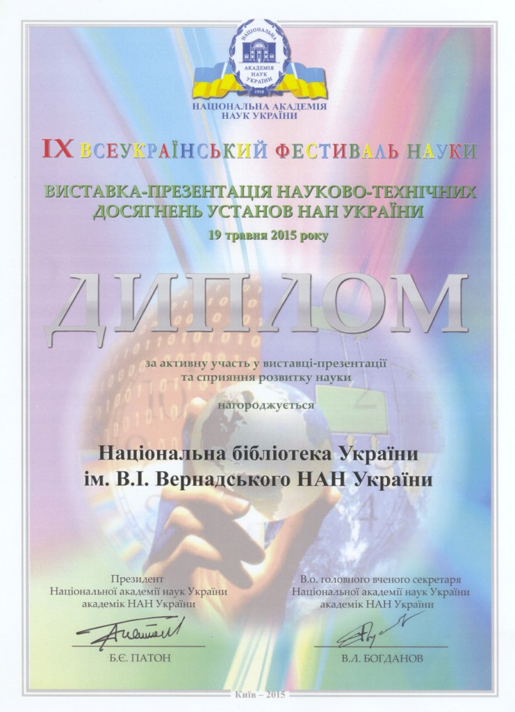 За результатами виставки-презентації за активну участь в її проведенні та сприяння розвитку науки Національна бібліотека України імені В.І.Вернадського відзначена дипломом ІХ Всеукраїнського фестивалю науки.