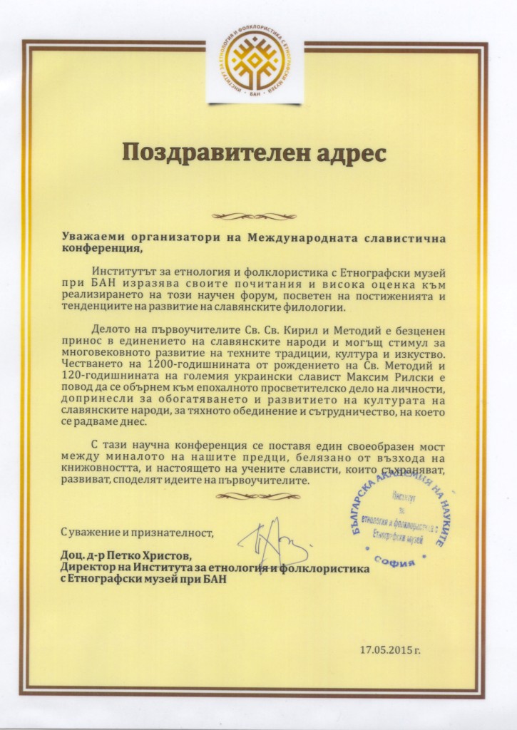 Директор Інституту етнології та фольклористики з Етнографічним музеєм Болгарської академії наук, доктор габілітований з етнології, доцент Петко Христов зачитав вітальну адресу учасникам конференції, відзначив високий рівень розвитку славістичних студій на теренах України та висловив сподівання на плідну співпрацю з українськими вченими.