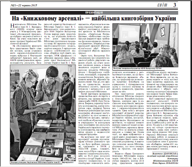 У статті м.н.с. Інституту бібліотекознавства НБУВ Валентини Здановської у газеті "СВІТ. Наука. Освіта. Техніка. Прогрес" (№ 21-22, червень 2015 р. - С. 3) йдеться про презентацію науково-видавничої діяльності НБУВ на V Міжнародному фестивалі "Книжковий Арсенал" що відбувся наприкінці квітня в Києві. (Фото Кирила Леванюка).