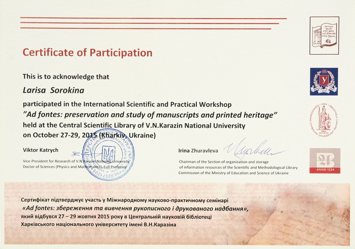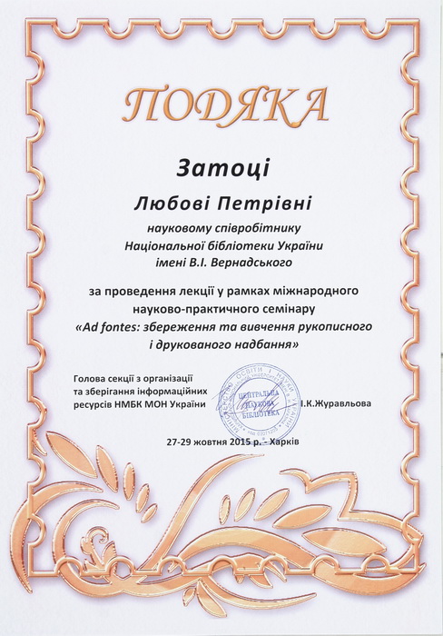 За участь у роботі міжнародного науково-практичного семінару фахівці ЦКР НБУВ Л.Затока та Л. Сорокіна отримали іменні сертифікати та подяки від секції з організації та зберігання інформаційних ресурсів НМБК МОН України.