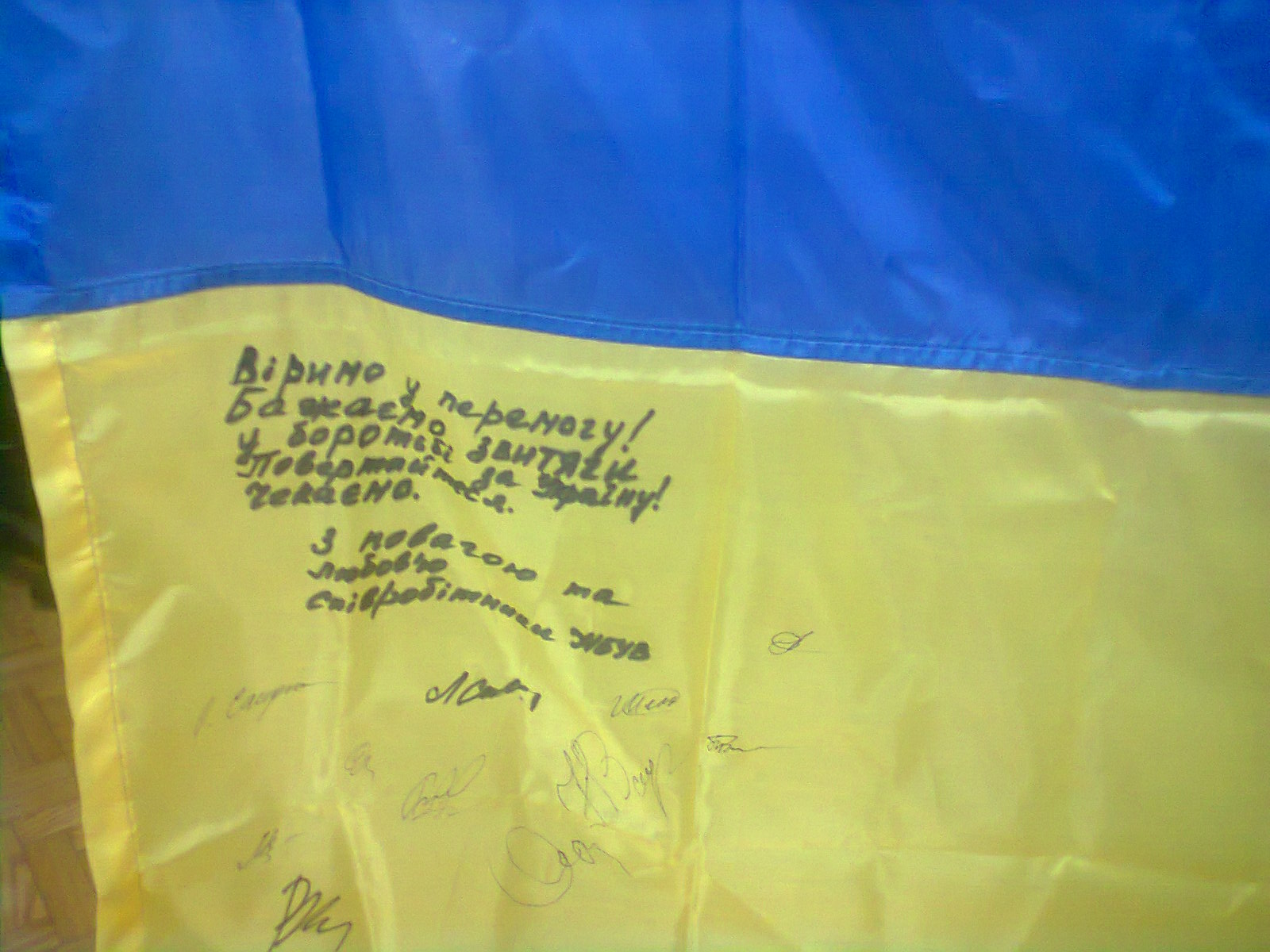 Ну а наші серця зворушив особливий подарунок – Державний прапор України від бійців 80-ї зенітної ракетно-артилерійської батареї. На ньому слова вдячності й підписи солдат з усіх куточків нашої великої країни.