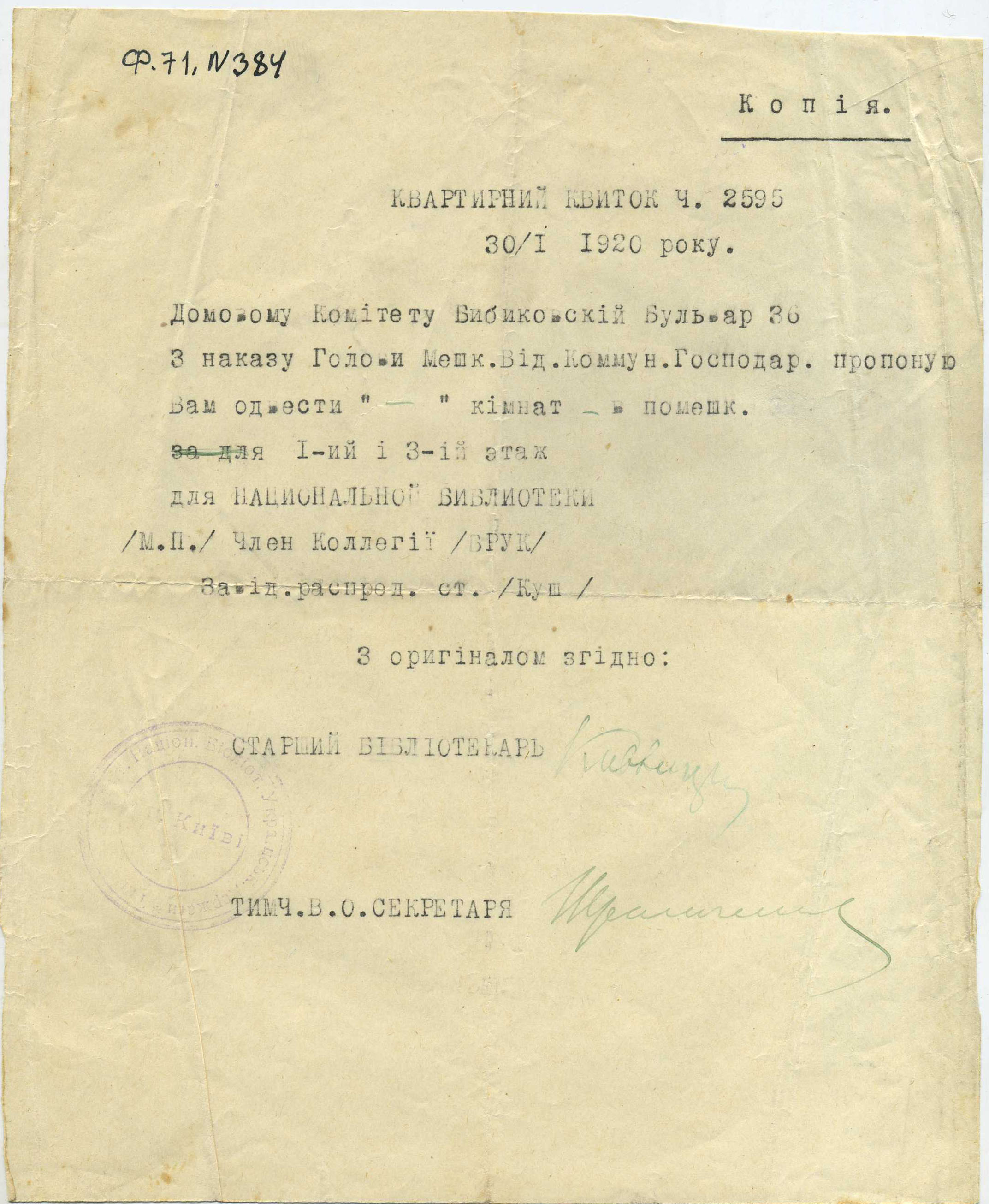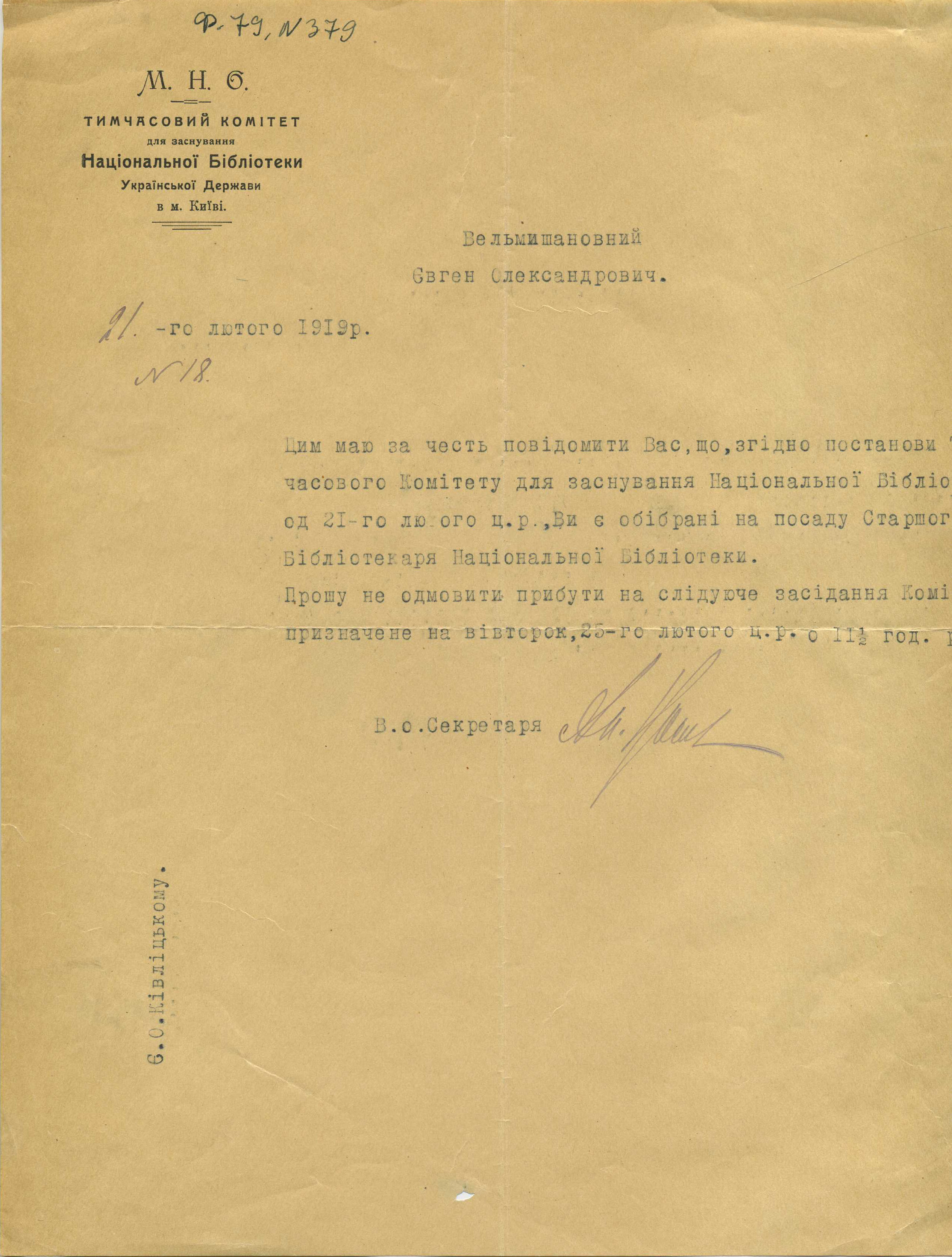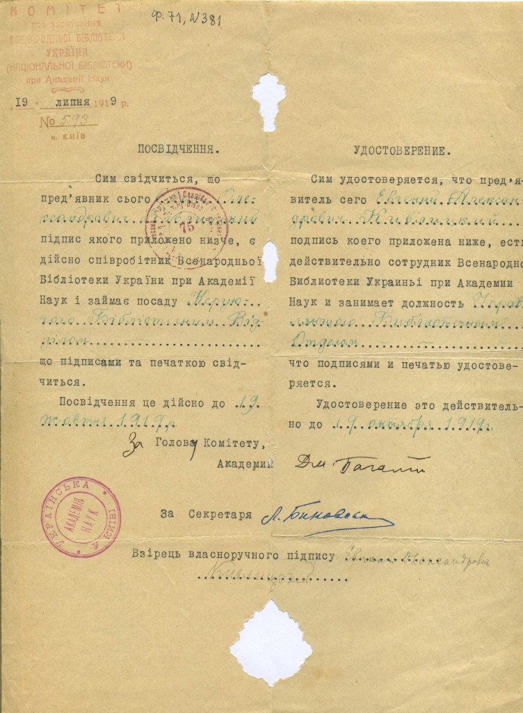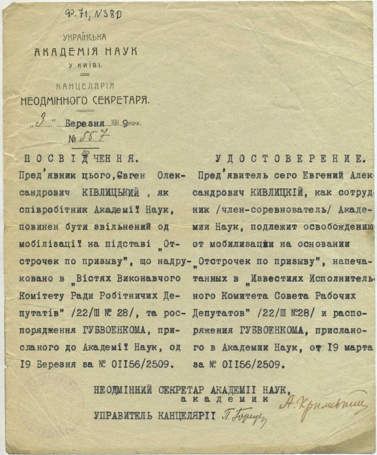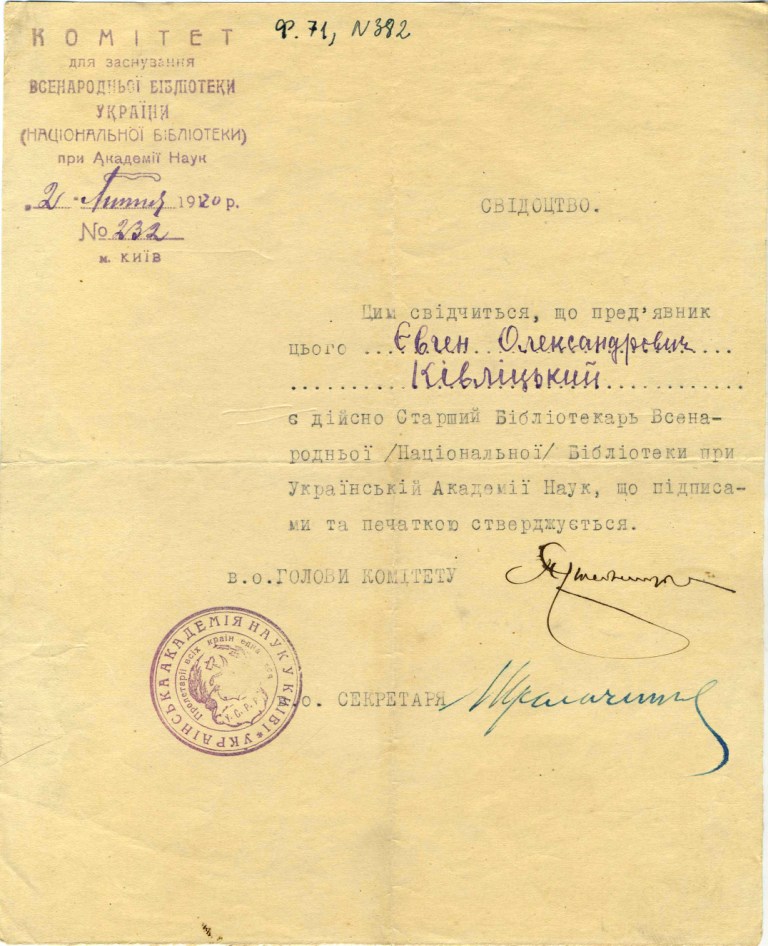 «Поступила библиотека Скордели, очень интересная, гл[авным] обр[азом] юридическая. Вопрос о Публ[ичной] библ[иотеке] пока стоит так. Она останется самостоятельной (в ведении Наркомпроса) в качестве областной для Правобережной Украины, как Харьковская для Левобережной и Слободской и Одесская для Юга. Но это только предварительное решение. Книги для нас из взятых на учет будут регистрированы только через месяц (в Книжной палате) и тогда переданы нам. Из склада при Публичной библиотеке книги будут переданы, вероятно, скоро, но надо следить, чтобы не выхватили чего-нибудь, хотя, по-видимому, высшая власть (Масловский) к нам благоволит. И сейчас иду отбирать в складе книги. Всего лучшего. Преданный Вам Е. Кивлицкий»
