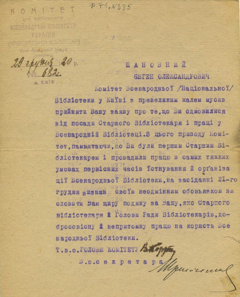 «Комітет Всенародної (Національної) Бібліотеки у Київі з привеликим жалем мусив прийняти Вашу заяву про те, що Ви одмовилися від посади Старшого Бібліотекаря і праці у Всенародній Бібліотеці. З цього приводу Комітет, памъятаючи, що Ви були першим Старшим бібліотекарем і провадили працю в самих тяжких умовах первісних часів існування й організації Всенародньої Бібліотеки, на засіданні 21-го грудня визнав своїм неодмінним обов’язком висловити Вам щиру подяку за Вашу, яко Старшого Бібліотекаря й Голови ради Бібліотекарів, добросовісну й непритомну працю на користь Всенародньої бібліотеки».