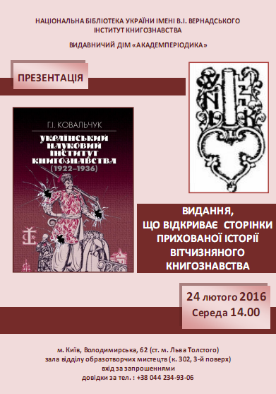 24 лютого (середа) у Національній бібліотеці України імені В.І. Вернадського відомий учений-книгознавець, директор Інституту книгознавства НБУВ професор Галина Ковальчук презентує монографію «Український науковий інститут книгознавства (1922–1936)» – видання, яке щойно побачило світ у Видавничому домі «Академперіодика».
