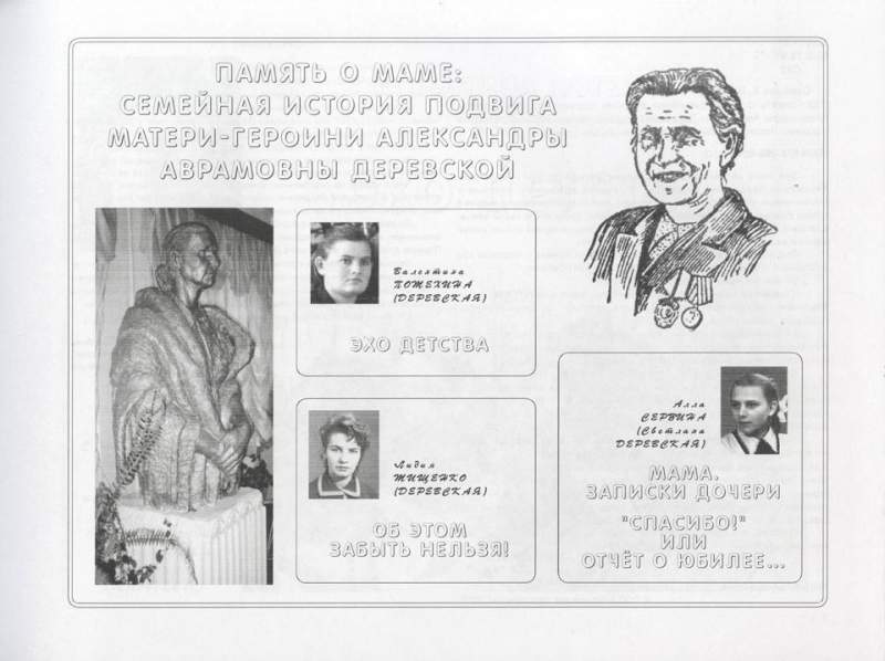 Алла Іванівна Сербіна, подарувала НБУВ видання "Память о Маме: семейная история подвига Матери-героини Александры Аврамовны Деревской". Сербина А. И. Память о Маме: семейная история подвига Матери-героини Александры Аврамовны Деревской: художественно-публицистическое издание. - Лисичанськ: ТОВ "Лисичанська друкарня", 2015. - 257 с. Видання присвячене історії життя Матері-героїні Олександри Абрамівна Деревської (1902-1959). У важкі довоєнні, воєнні та повоєнні роки Олександра Аврамівна разом з чоловіком Омеляном Костянтиновичем, підібрала, прихистила у своїй родині, виходила, виростила, виховала і стала рідною матір'ю сорока восьми дітей-сиріт різних національностей, доль та вікових груп. Вона нагороджена орденом «Трудовий Червоний Прапор» і медаллю «За героїчну працю у Великій Вітчизняній війні 1941 - 1945 рр.». «Про відзначення 110-річчя з дня народження матері-героїні Олександри Деревської» прийнято Постанову Верховної Ради України № 4607-VI від 22 березня 2012 року. Ця книга – збірник спогадів трьох сестер сім'ї Деревської. У ній читачеві відкриваються нові сторінки історії материнського подвигу. З розповіді про родину Деревських стає очевидною і зрозумілою роль батька. Доля сім'ї тісно переплітається в спогадах з історичними подіями країни. Умови життя сім'ї у воєнні та повоєнні роки були не менш складними, а ніж сьогодні. Але діти, що вийшли з цієї сім'ї, стали гідними громадянами своєї Батьківщини. Педагогічна спадщина родини Деревської - справжня знахідка для молодих та вже немолодих батьків і для будь-якого педагога. Важливим доповненням до цієї збірки є унікальний архів друкованих, аудіо, відео та фотоматеріалів про сім'ю Деревської - дітей, Матері і Батька, зібраний в "Віртуальному музеї пам'яті Матері-героїні Олександри Аврамівни Деревської" на сайті www.derevskaja.com