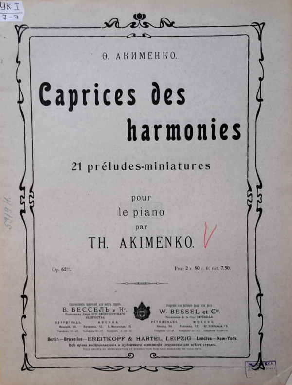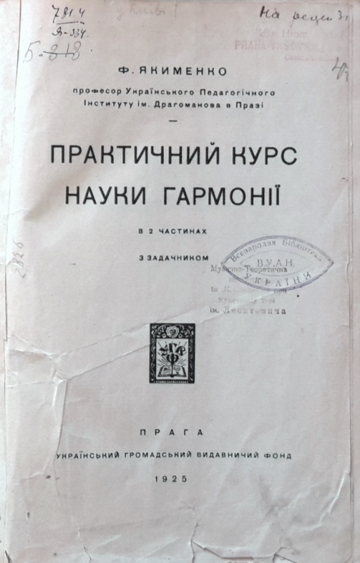 З 1924 року Федір Якименко працював у Празі на посаді професора музичного відділу Українського вищого педагогічного інституту імені М. Драгоманова. Найбільш відомими учнями Якименка були Микола Колесса і Зиновій Лисько. Крім композиторської, педагогічної, концертно-піаністичної діяльності, Федір Степанович був також диригентом хору та теоретиком музики. Саме у Празі з’явилася його ґрунтовна музично-теоретична праця «Практичний курс науки гармонії у двох частинах з задачником». Доля видання була зумовлена історичними реаліями ХХ століття, сталося так, що видання стало раритетним. Про нечисленність примірників, що збереглися, свідчить хоча б той факт, що «Практичний курс науки гармонії» помилково датується 1926 роком у довідниках та енциклопедіях. Тобто мало хто з дослідників, мабуть, тримав це видання в руках. Адже на обкладинці і титульному аркуші видання є дата публікації – 1925 рік (див. фото № 11).