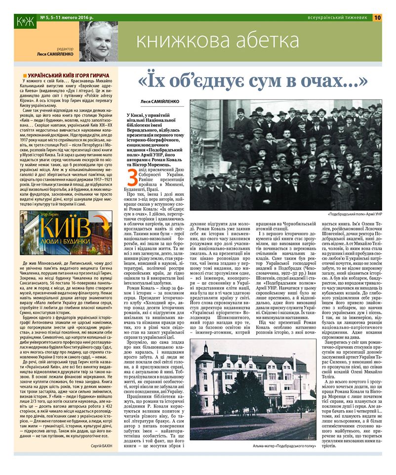 Стаття Лесі Самійленко у тижневику «Культура і життя» (№ 5, 5-11 лютого 2016) про презентацію першого тому історико-біографічного енциклопедичного видання «“Подєбрадський полк” Армії УНР» (авт.: Роман Коваль та Віктор Моренець), що відбулася в Національній бібліотеці України імені В.І. Вернадського на відзначення Дня Соборності України.