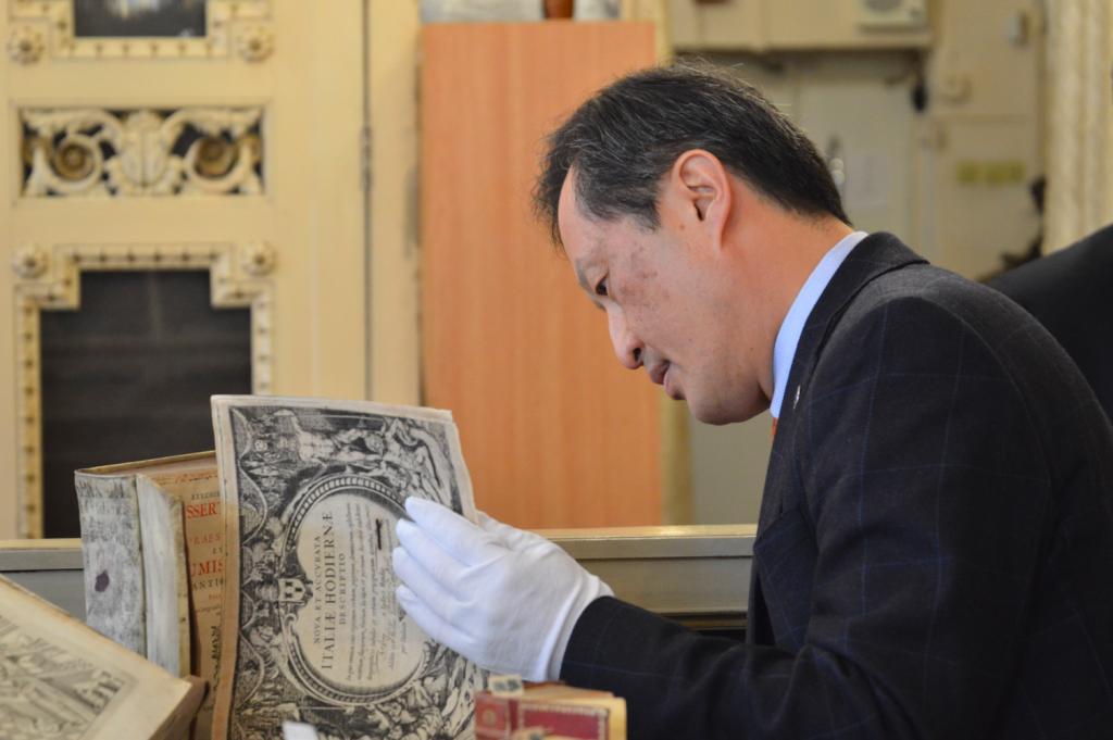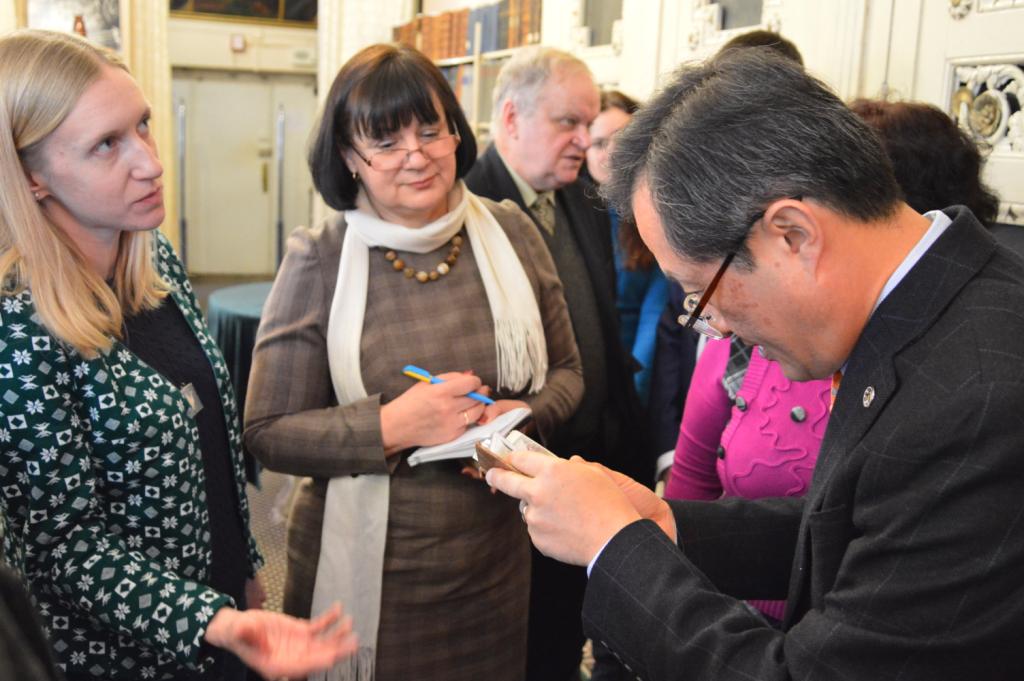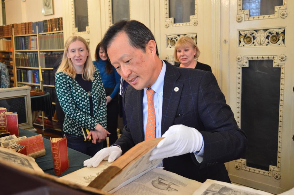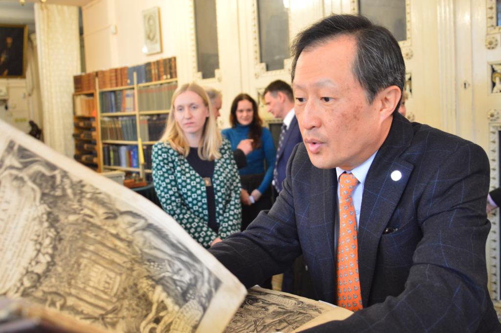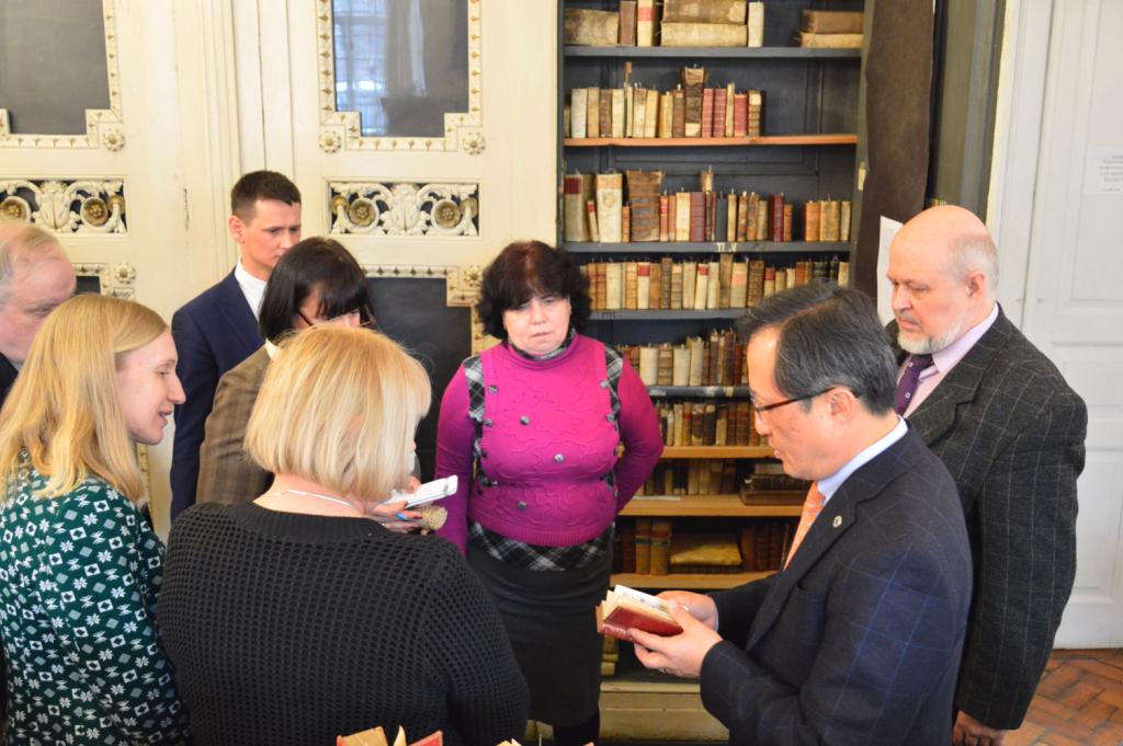 З цікавістю Йонг Сук Чі ознайомився з раритетними пам’ятками із фондів Інституту рукопису НБУВ: перлиною вітчизняної рукописної культури – Пересопницьким Євангеліє та колекцією фоноциліндрів єврейської музичної спадщини, а також оглянув колекцією ельзевірів, що зберігаються у відділі стародруків та рідкісних видань Інституту книгознавства НБУВ, з метою подальшого розроблення проекту створення цифрових копій цих видань і введення даних про київську колекцію до світової інформаційної бази даних ельзевірів кінця XVI початку XVIII ст.