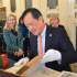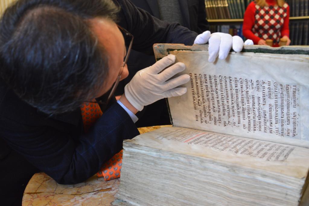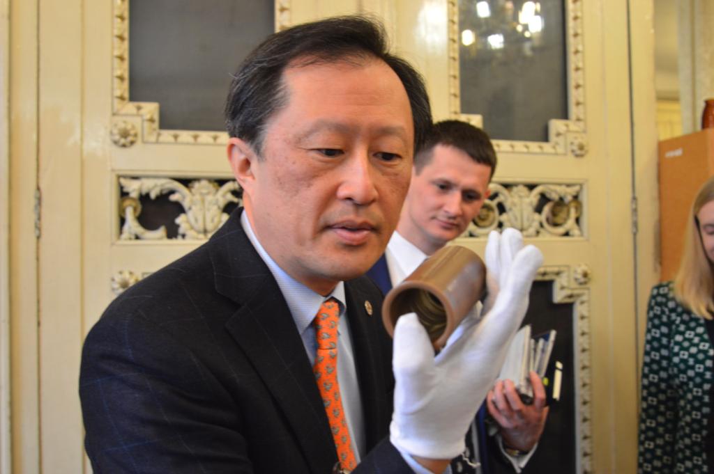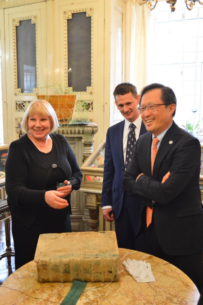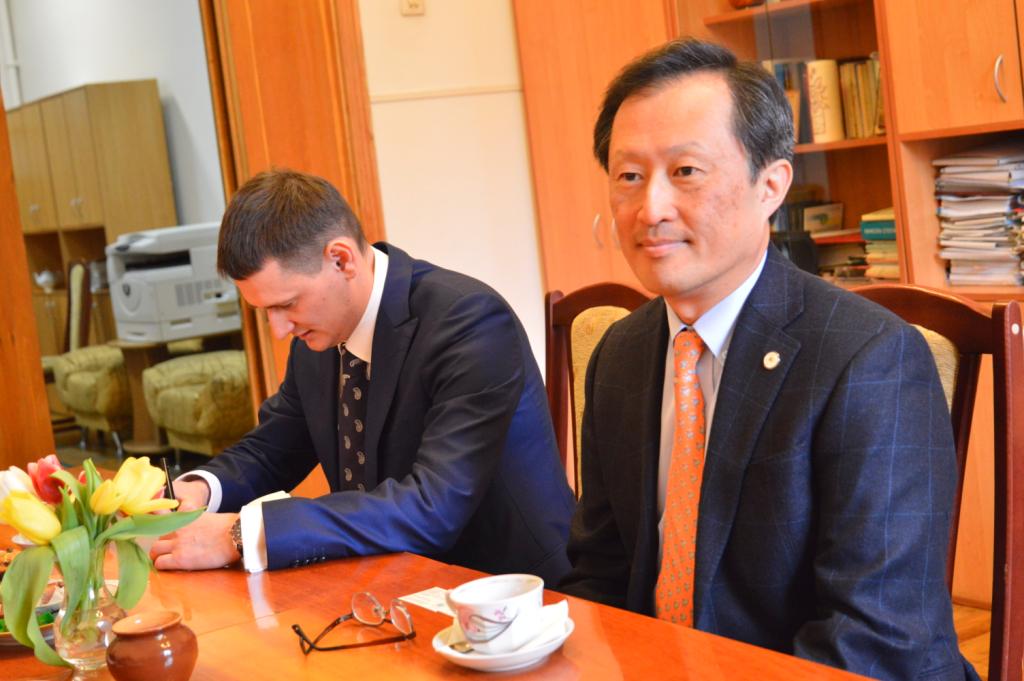 З цікавістю Йонг Сук Чі ознайомився з раритетними пам’ятками із фондів Інституту рукопису НБУВ: перлиною вітчизняної рукописної культури – Пересопницьким Євангеліє та колекцією фоноциліндрів єврейської музичної спадщини, а також оглянув колекцією ельзевірів, що зберігаються у відділі стародруків та рідкісних видань Інституту книгознавства НБУВ, з метою подальшого розроблення проекту створення цифрових копій цих видань і введення даних про київську колекцію до світової інформаційної бази даних ельзевірів кінця XVI початку XVIII ст.
