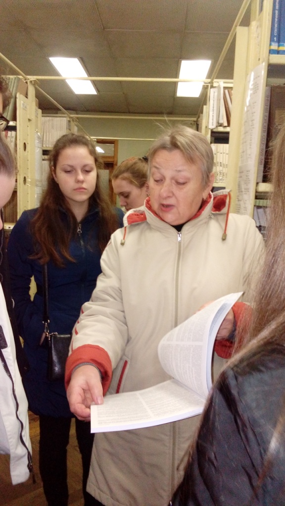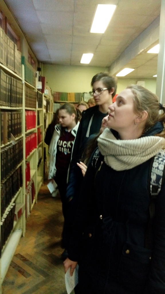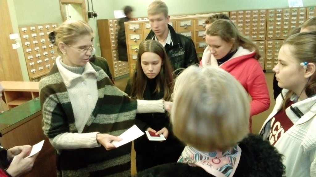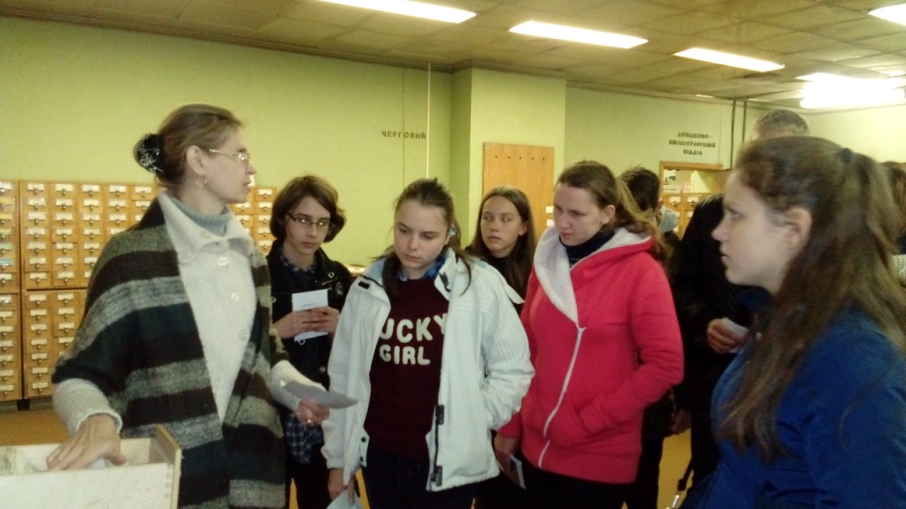 Ознайомлення школярів з головною науковою бібліотекою країни продовжилось у Центрі науково-бібліографічної інформації. У залі каталогів завідувач сектору обслуговування Юлія Фіх ознайомила майбутніх математиків з правилами пошуку в системі карткових каталогів НБУВ, показала місце розташування в них розділів з математичних наук.