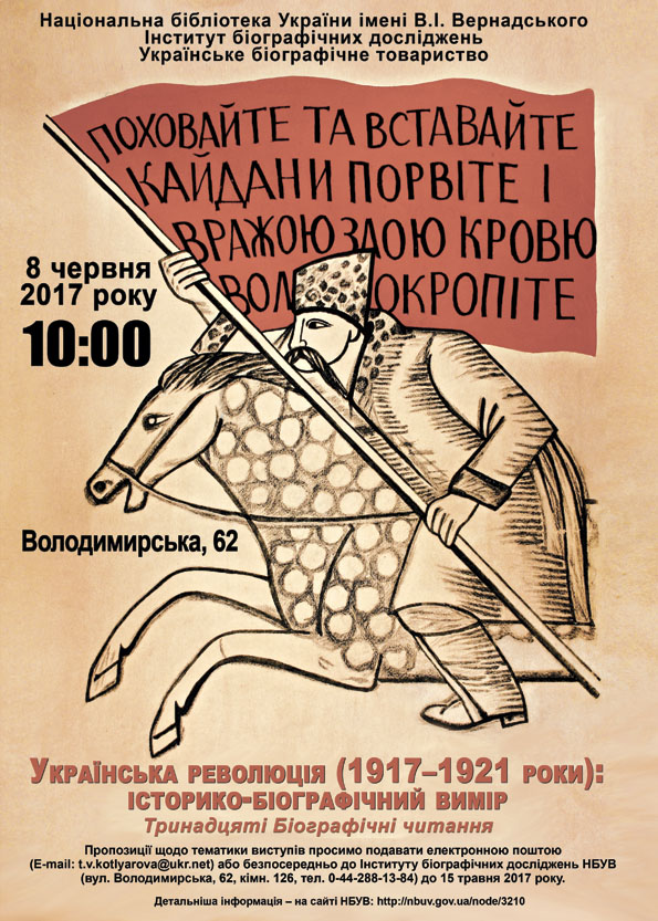 Інститут біографічних досліджень Національної бібліотеки України імені В.І. Вернадського та Українське біографічне товариство запрошують до участі у роботі Тринадцятих Біографічних читань «Українська революція (1917–1921 роки): історико-біографічний вимір», присвячених подіям, що відбувались у нашій країні на початку ХХ ст.