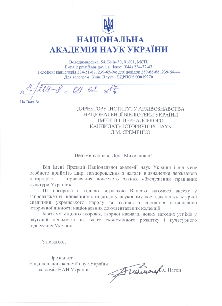 Президент України підписав Указ "Про відзначення державними нагородами України з нагоди Дня Соборності України". Почесне звання «Заслужений працівник культури України" присвоєно директору Інституту архівознавства Національної бібліотеки України імені В.І.Вернадського Лідії Миколаївні Яременко.