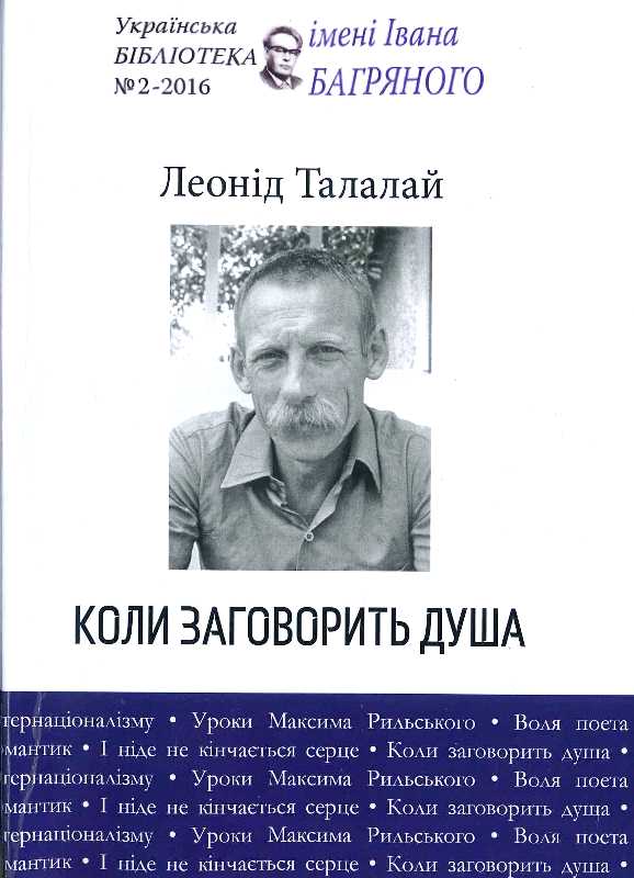 4. Талалай Леонід. Коли заговорить душа / упоряд. Раїса Талалай. – Київ : Укр. б-ка ім. Івана Багряного, 2016. – 191 с. – (Українська бібліотека ім. Івана Багряного ; 2016, № 2).
