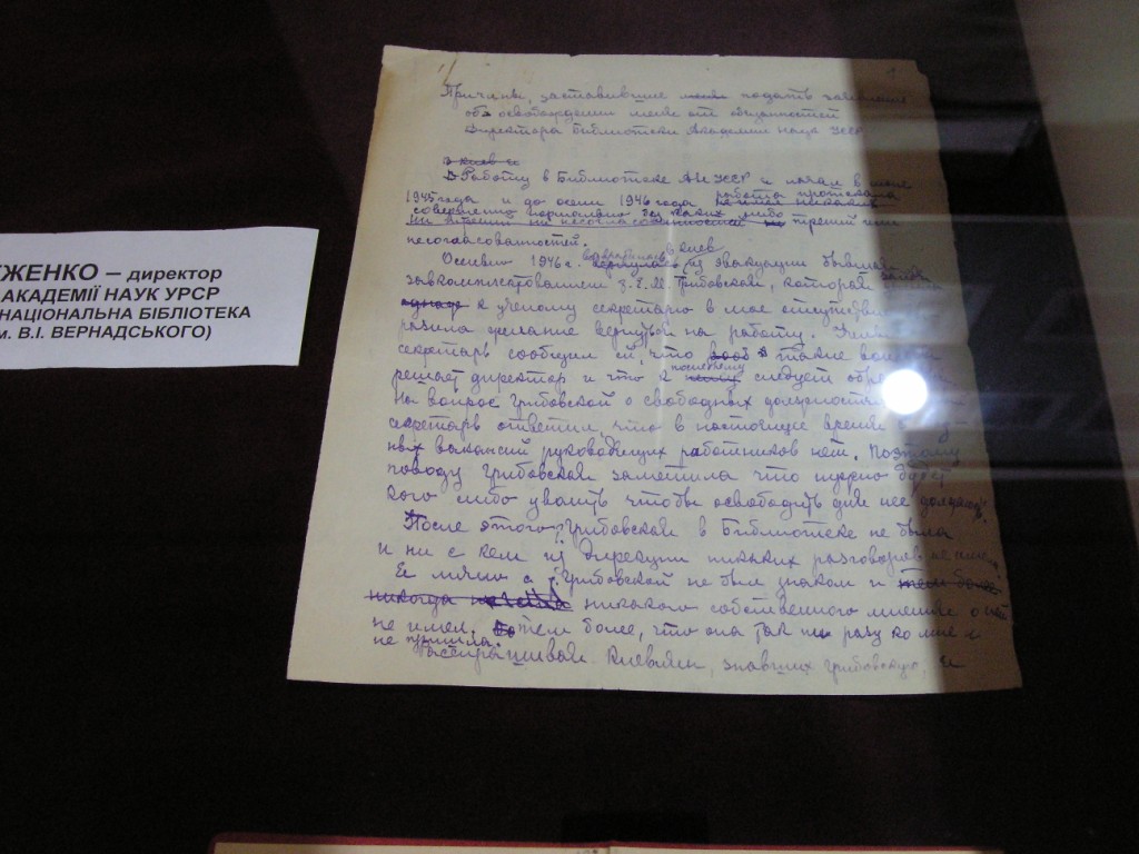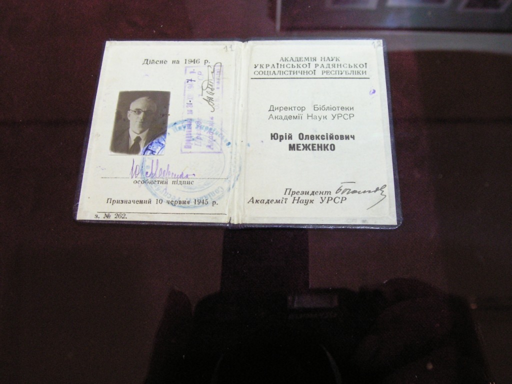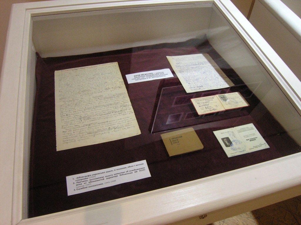 На окремому стенді виставки демонструються документи, що засвідчують діяльність Меженка на посаді директора Бібліотеки АН України у 1945-1947 рр., зокрема, світлини, особисті та службові документи, серед них – рукопис «Причины, заставившие подать заявление об освобождении меня от обязанностей директора Библиотеки АН УССР» (1947).
