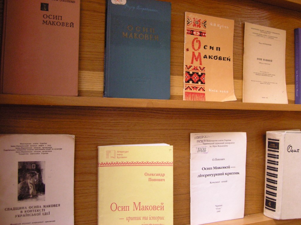 Окремо на виставці демонструються літературознавчі праці Осипа Маковея («Матеріали до життєписі Осипа Юрія Гординського Федьковича» (1910), «Життєпис Осипа Юрія Гординського Федьковича» (1911), «Панько Омелькович Куліш. Огляд його діяльності» (1900)) та ін.