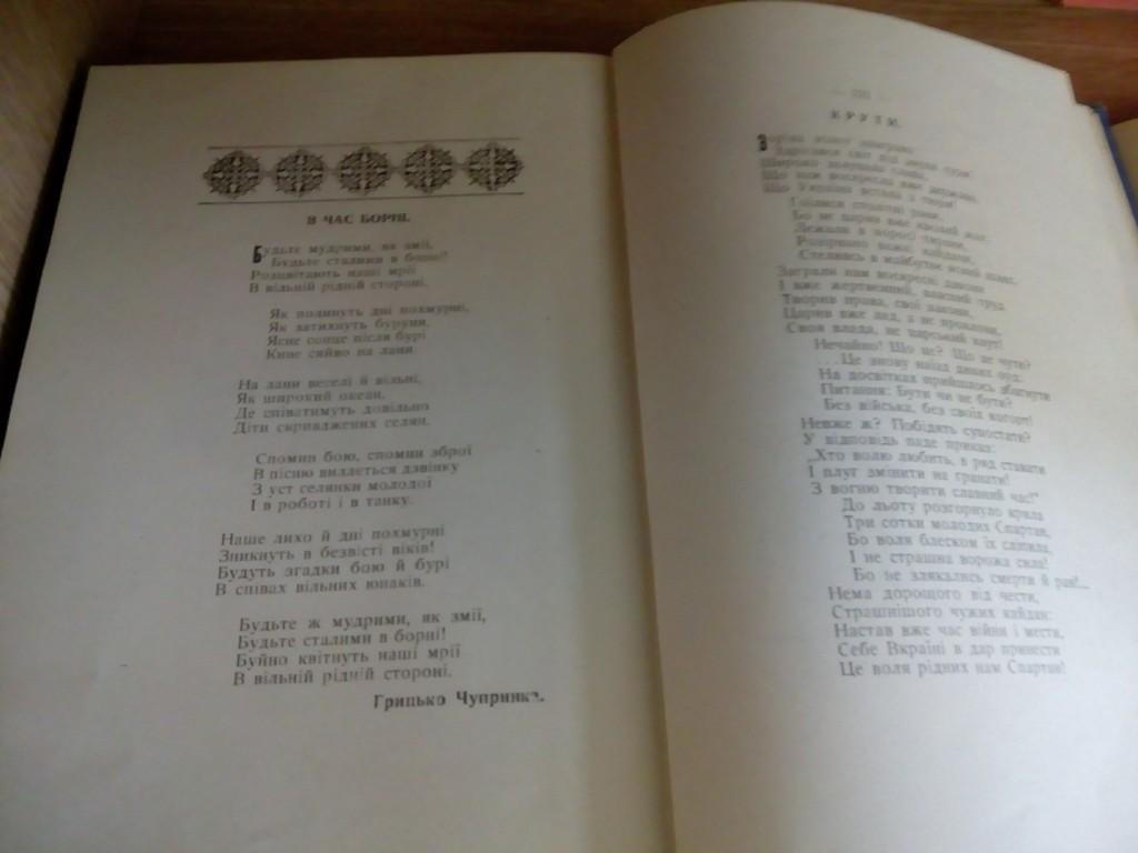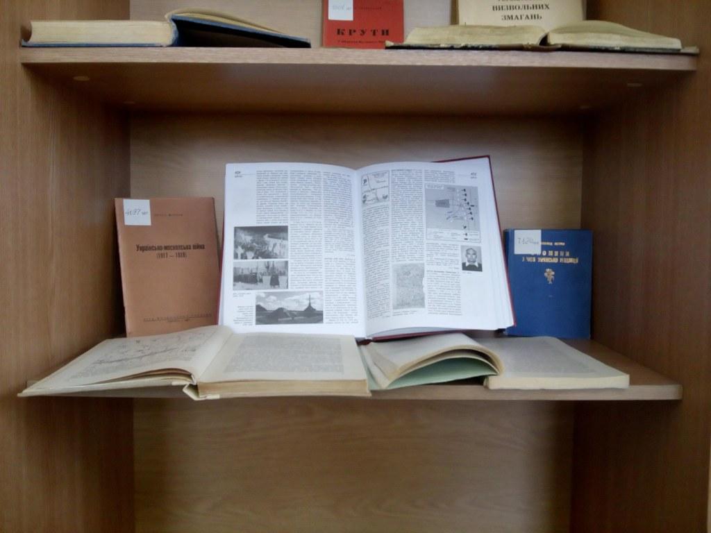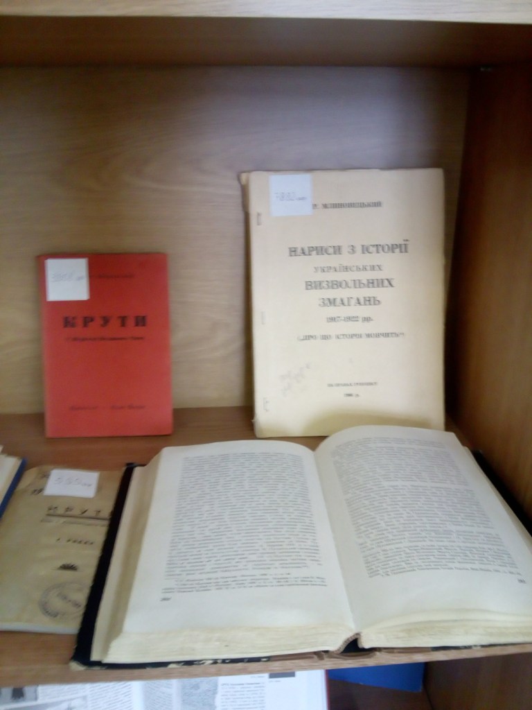У фонді відділу зарубіжної україніки зберігається значна кількість видань, присвячених тим героїчним подіям. На виставці представлені такі книги: Збаразький, С. «Крути: у 40-річчя великого чину 29 січня 1918-29 січня 1958». Дана праця детально описує передісторію тих подій, починаючи з повалення царату. Описується небажання соціалістів Центральної Ради мати власну армію через наївну віру в «російську демократію». Так і тривало до приходу більшовиків і початку війни. Про битву під Крутами багато публікацій містить журнал «Вісті комбатанта», який виходив у світ з 1961 по 2014 рр. в Канаді і США. На виставці представлені дві статті з журналу «Вісті комбатанта» за 1973 р.: «Крутянець. Думки до 55-ліття українських Термопілів» і «Панченко О. Командир героїв-крутянців Аверкій Гончаренко». Збірник «Сніп: український декляматор для молоді і старших» має розділ, де зібрано вірші, присвячені загиблим у битві під Крутами. Також представлені спогади відомих діячів тих часів: Д. Дорошенка, О. Удовиченка, а також працю В. Іваниса, присвячену Симонові Петлюрі, в якій віддається належне героїзму студентського куреня під Крутами. Як важлива подія часів першої більшовицько-української війни 1917–1918 рр. битва під Крутами знаходить відображення в праці «Історія українського війська», а також згадується в праці П. Мірчука «Українсько-московська війна (1917–1919)».