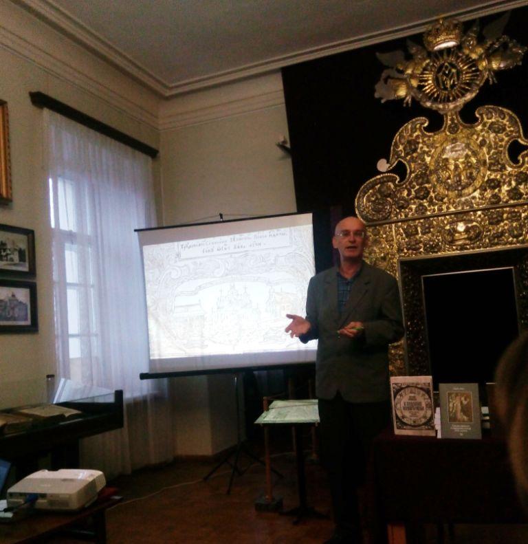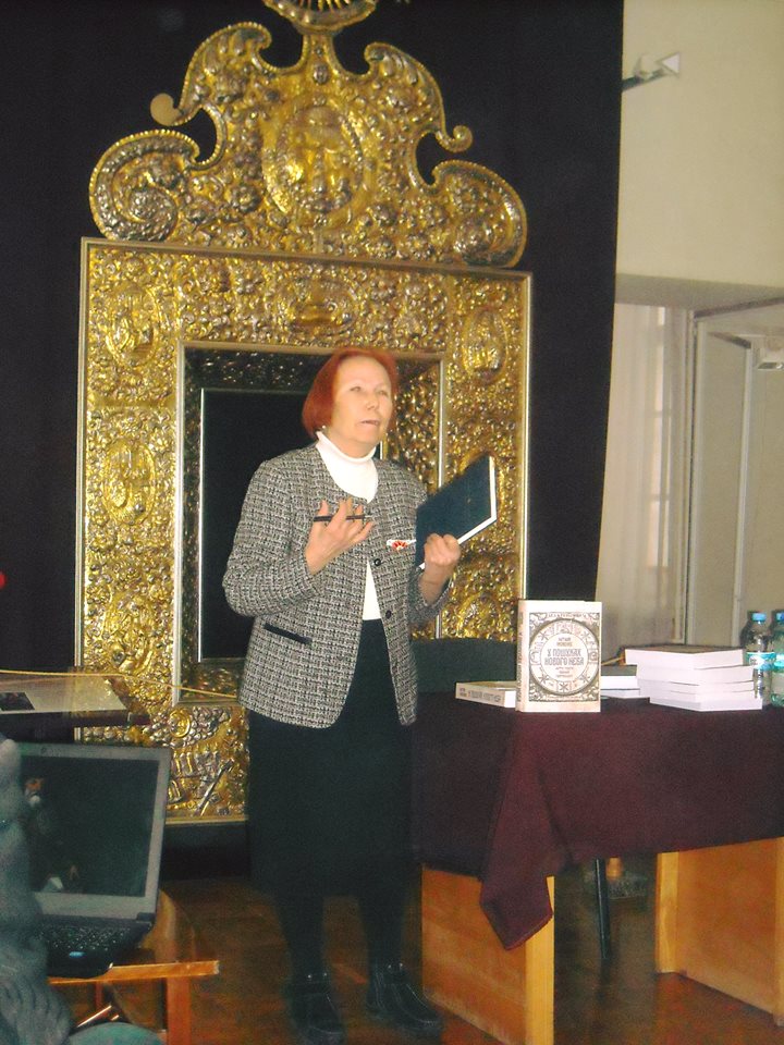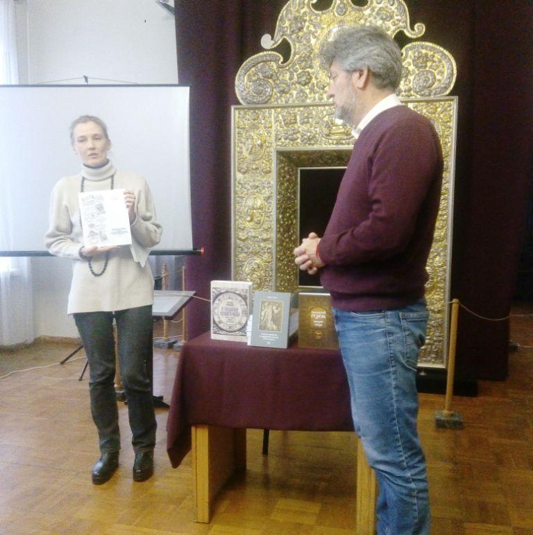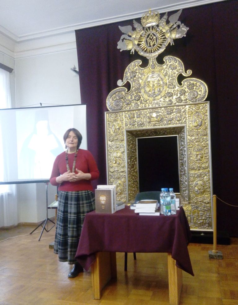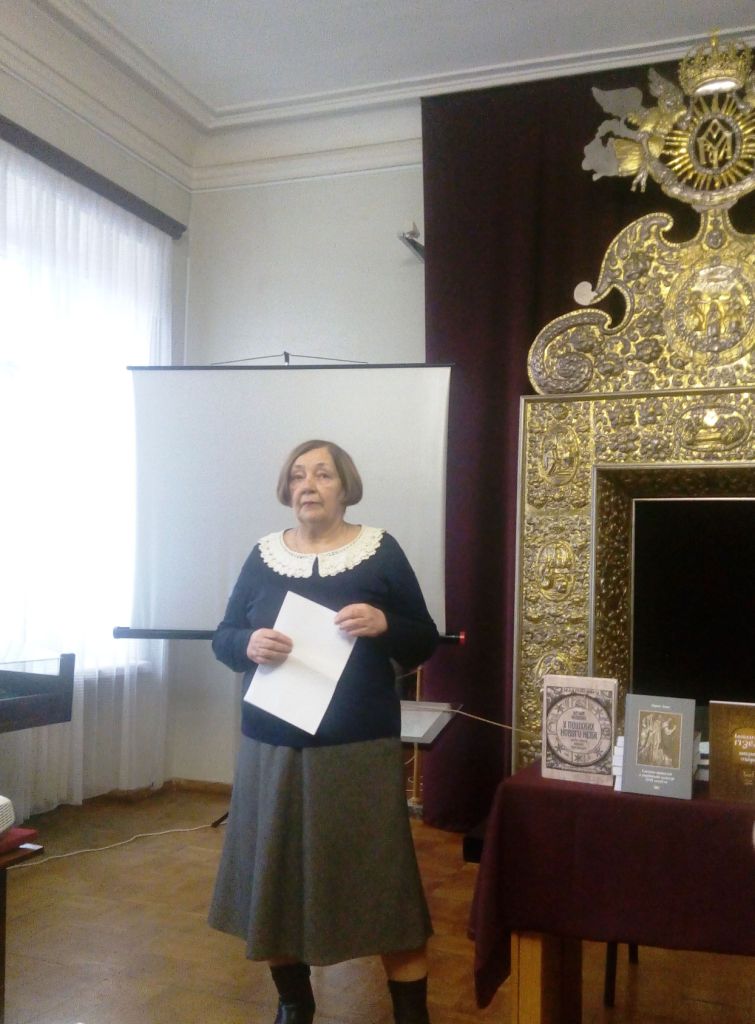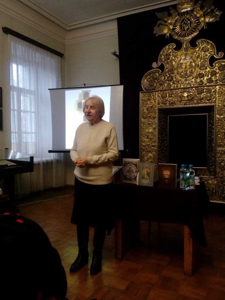 Наступною до слова була запрошена доктор філософських наук, професор Національної музичної академії України Лариса Довга, що говорила про коло київських інтелектуалів середини ХVІІ ст. і презентувала унікальне видання вибраних творів Інокентія Гізеля в трьох томах 2009-2012 р. та власну монографію «Система цінностей в українській культурі ХVІІ ст. (на прикладі теоретичної спадщини Інокентія Гізеля)» (Київ, 2012), і передала їх до фонду музею.