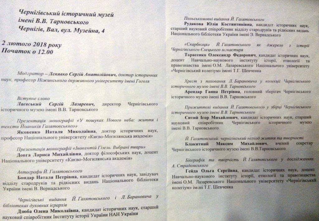 У повідомленні кандидата історичних наук, доцента Національного університету «Чернігівський колегіум» імені Тараса Шевченка Олександра Тарасенка йшлося про відомості в творах Й. Галятовського з давньої історії Чернігівського Єлецького монастиря. Надзвичайно зацікавила присутніх розповідь головного зберігача Чернігівського історичного музею Ганни Арендар про хрест з поховання Лазаря Барановича і атрибуцію записів на ньому. Кандидат історичних наук, старший науковий співробітник Чернігівського історичного музею Ігор Ситий ознайомив учасників з особливостями раритетних прижиттєвих видань Й.Галятовського у музейній збірці.