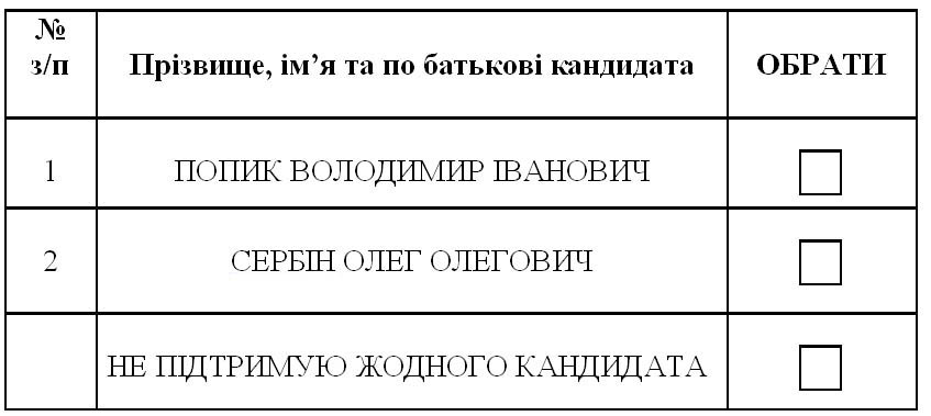 Той, хто голосує, робить навпроти прізвища одного з кандидатів позначку “плюс” або іншу, що засвідчує волевиявлення, у квадраті з написом «ОБРАТИ». Якщо особа, яка бере участь у голосуванні, не підтримує жодного кандидата, ставиться позначка “плюс” або інша у квадраті відповідного рядка бюлетеня.