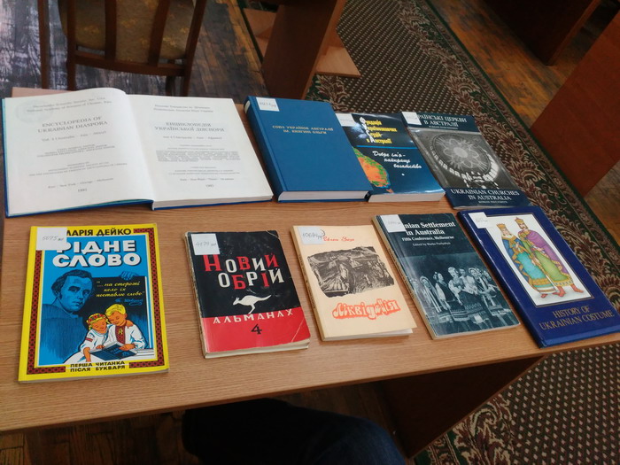 Завідувач відділу зарубіжної україніки, доктор історичних наук Т. Д. Антонюк ознайомила учасників з книжковою виставкою «Українська книга в Австралії». Вона зазначила, що видань, які б розкривали тему участі українців у Першій світовій війні в складі Австралійських збройних сил, у фонді зарубіжної україніки не виявлено, але пошук був корисним, він спонукав до глибшого опрацювання літератури, що видавалася діаспорою Австралії, нового прочитання деяких текстів. Книжкова виставка репрезентує друковану продукцію, видану нашими співвітчизниками на далекому австралійському континенті, а також видану в Україні після 1991 року. Ці видання відкривають духовні й матеріальні здобутки, напрями і форми діяльності іммігрантів-українців. Очільниця відділу звернула увагу присутніх на два томи видання «Українці в Австралії», четвертий том «Енциклопедії Української діаспори», «Словник українських прізвищ в Австралії» С. Радіона та інші твори, присвячені українським емігрантам, які прибули до Австралії після Другої світової війни, їхнім нащадкам та організаціям: церковним, громадським, культурно-мистецьким, освітнім, молодіжним, жіночим, кооперативним, ветеранським, політичним, спортивним. Ці джерела пов’язані тим, що несуть загальні цінності, а саме: відданість політичному ідеалові незалежної України, готовність зберігати українську самосвідомість, самовіддана праця в структурах української спільноти.