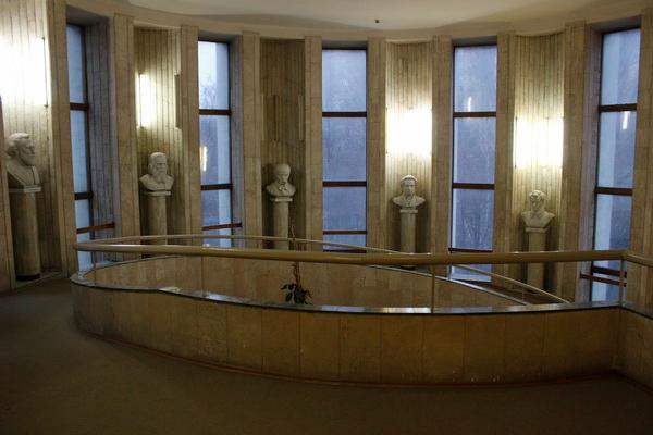 Уздовж пандусу (пологих сходів), що з’єднує перший і другий поверхи Бібліотеки, встановлені 11 мармурових бюстів видатних діячів, які зробили значний внесок у розвиток світової науки і культури: Ярослав Мудрий, Іван Федоров, Михайло Ломоносов, Григорій Сковорода, Микола Лобачевський, Олександр Пушкін, Тарас Шевченко, Дмитро Менделєєв, Ілля Мечников, Костянтин Ціолковський та Олександр Попов.