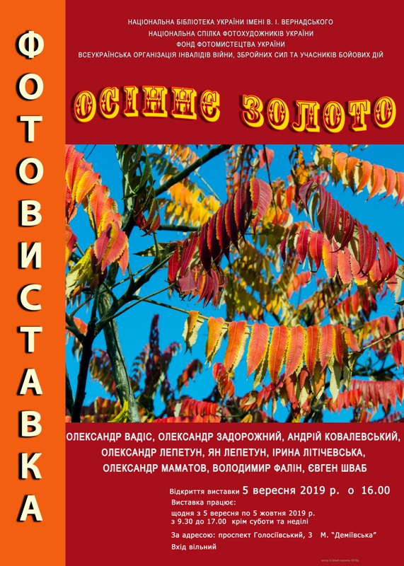 Колектив фотохудожників, а саме – Олександр Вадіс, Олександр Задорожний, Андрій Ковалевський, Олександр Лепетун, Ян Лепетун, Ірина Літічевська, Олександр Маматов, Володимир Фалін, Євген Шваб – підготував фотовиставку «Осіннє золото», яка висвітлює красу природи у період осінніх метаморфоз.