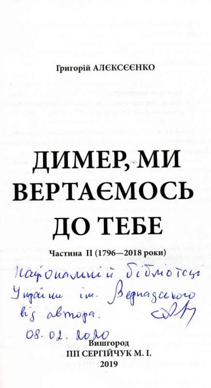 Алєксєєнко Г. Димер, ми вертаємося до тебе. Частина II (1796–2018 роки) / Г. Алєксєєнко. – Вишгород: ПП Сергійчук М. І., 2019. – 416 с.