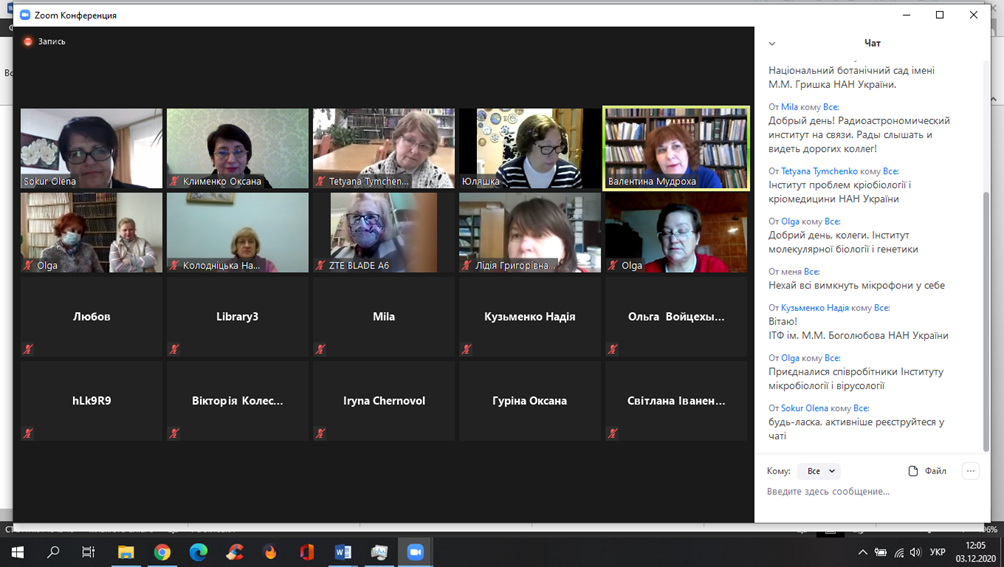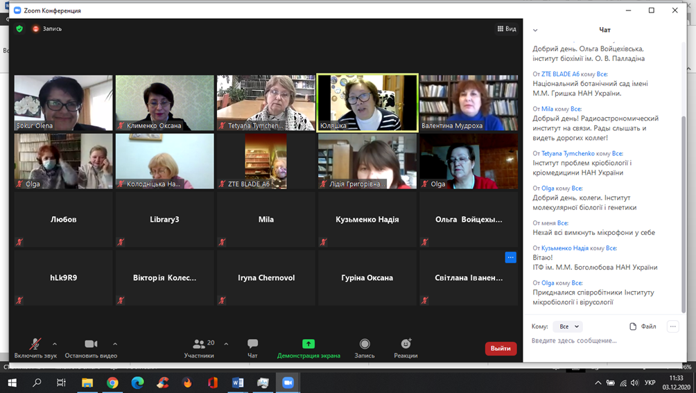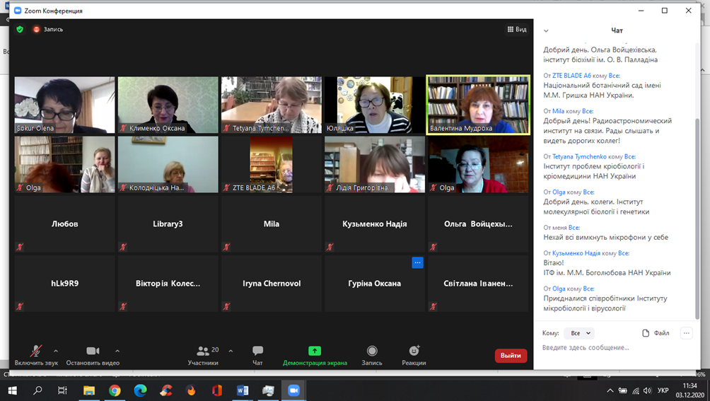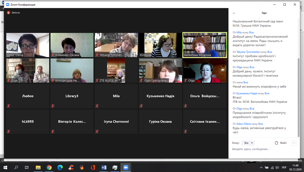 3 грудня 2020 року відбувся традиційний щорічний семінар для працівників бібліотек наукових установ Національної академії наук України «Бібліотека наукової установи: підсумки, завдання та пріоритети діяльності» у форматі онлайнової зустрічі на платформі Zoom (модератор ‒ старший науковий співробітник Інституту бібліотекознавства НБУВ, кандидат наук із соціальних комунікацій О. Л. Сокур). У роботі заходу, який провела виконавчий секретар Інформаційно-бібліотечної ради НАН України, провідний науковий співробітник Інституту бібліотекознавства НБУВ, кандидат історичних наук, старший науковий співробітник Г. І. Солоіденко, взяли участь більше 30 учасників, зокрема – представники Національної бібліотеки України імені В. І. Вернадського, Львівської національної наукової бібліотеки України імені В. Стефаника, бібліотек Інституту електрозварювання ім. Є. О. Патона НАН України, Фізико-механічного інституту ім. Г. В. Карпенка НАН України, Інституту надтвердих матеріалів ім. В. М. Бакуля НАН України, Інституту кібернетики ім. В. М. Глушкова НАН України, Міжнародного науково-навчального центру інформаційних технологій та систем НАН України, Інституту теоретичної фізики ім. М. М. Боголюбова НАН України, Головної астрономічної обсерваторії НАН України, Радіоастрономічного інституту НАН України, Інституту біохімії ім. О. В. Палладіна НАН України, Інституту мікробіології і вірусології ім. Д. К. Заболотного НАН України, Інституту молекулярної біології і генетики НАН України, Інституту проблем кріобіології і кріомедицини НАН України, Інституту електродинаміки НАН України, Інституту клітинної біології та генетичної інженерії НАН України, Національного ботанічного саду ім. М. М. Гришка НАН України, Інституту археології НАН України.