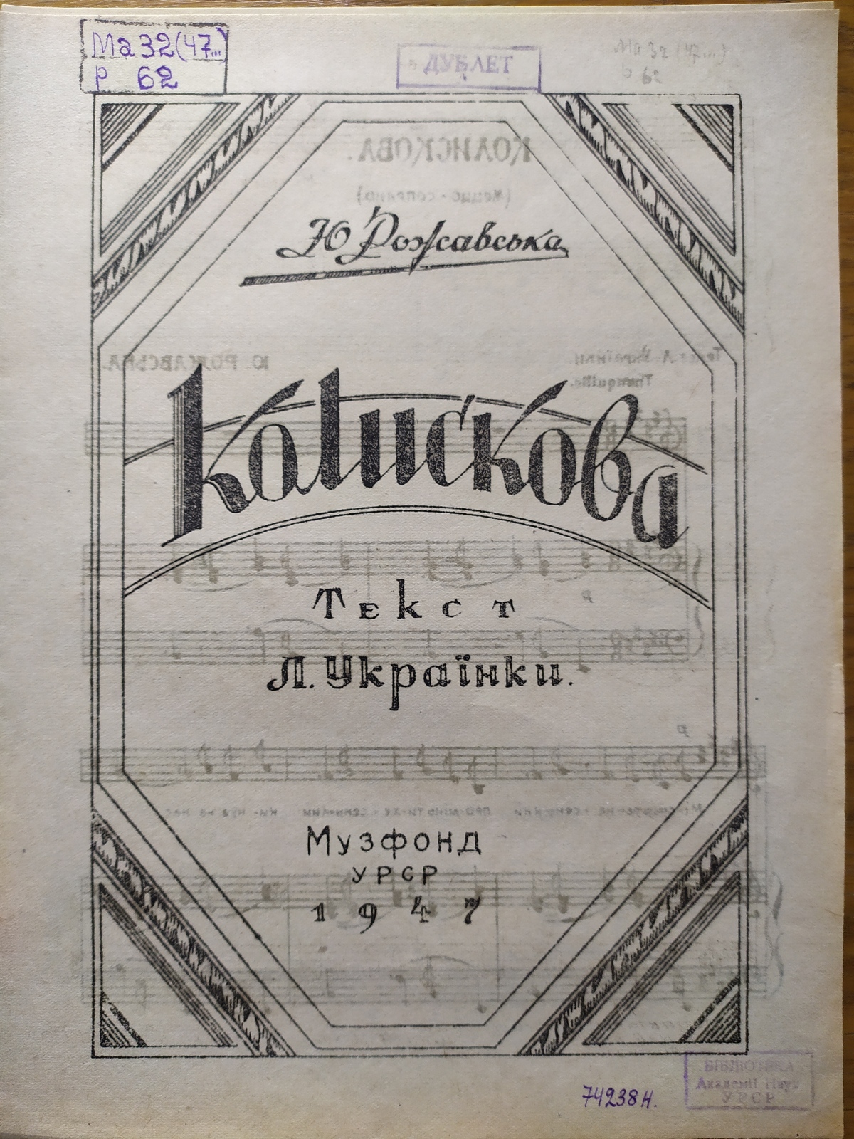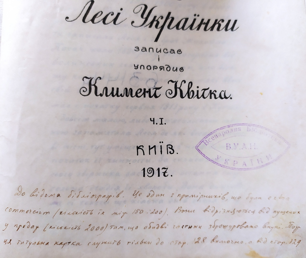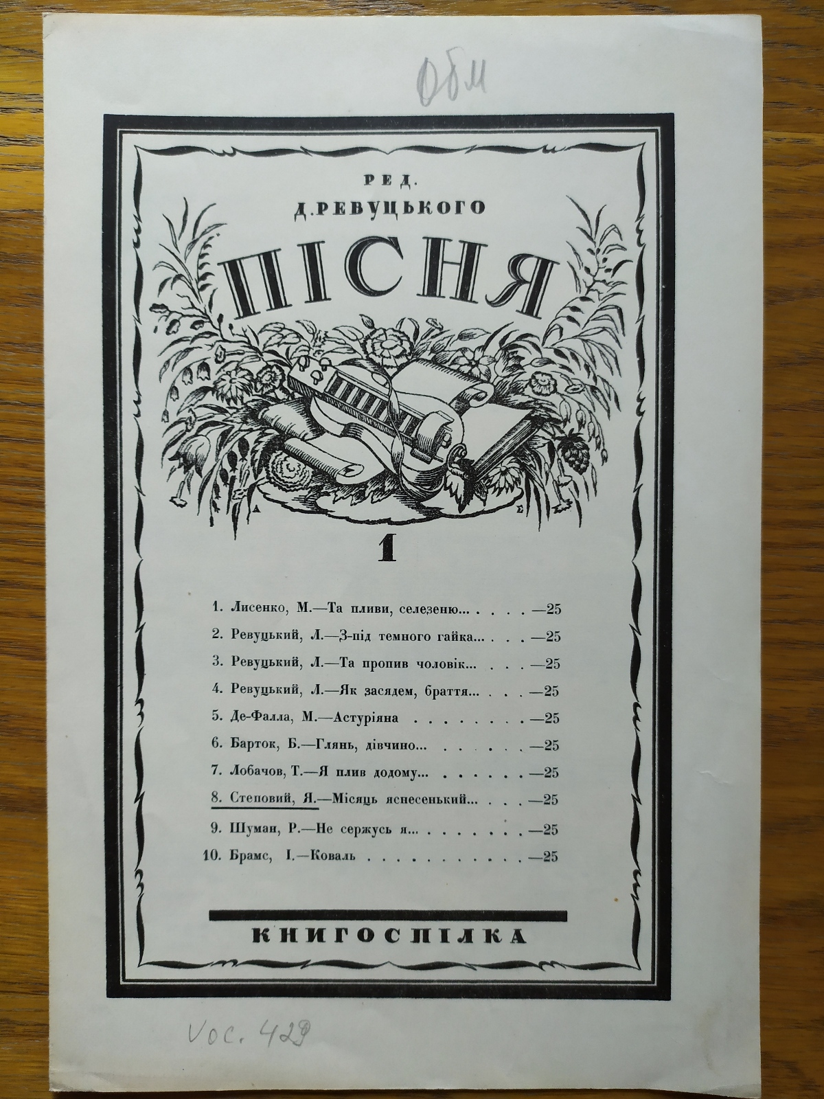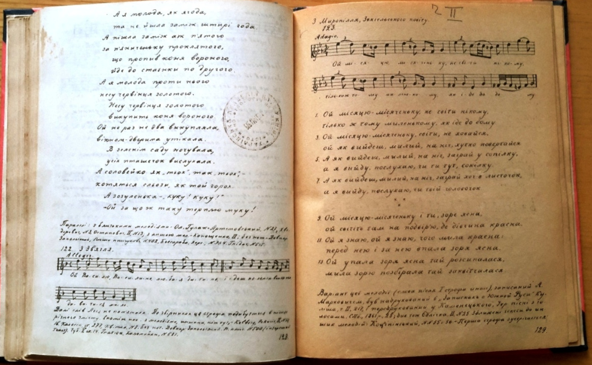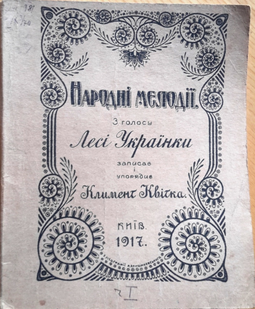 Про великий музичний дар та безмежну любов до народної пісні, яку Леся Українка пронесла крізь усе життя, свідчить її багаторічна робота як фольклористки – записи та видання народних мелодій з Волинської, Полтавської, Івано-Франківської, Житомирської, Рівненської областей України та народні мелодії, які записали Микола Лисенко та Климент Квітка з її голосу. (Іл. № 1). Зокрема, у відділі зберігається декілька примірників рідкісного видання – «Народні мелодії з голосу Лесі Українки» у двох частинах, записані і упорядковані чоловіком Лесі Українки Климентом Квіткою. Видання вийшло після смерті поетеси, вже у 1917–1918 рр. як фотомеханічний друк з рукописного автографа К. Квітки. Два примірники мають дарчі написи: один – професорові Я. Акименкові та другий – до бібліотекарів Всенародної бібліотеки України (нині Національна бібліотека України імені В. І. Вернадського). (Іл. № 2–5).
