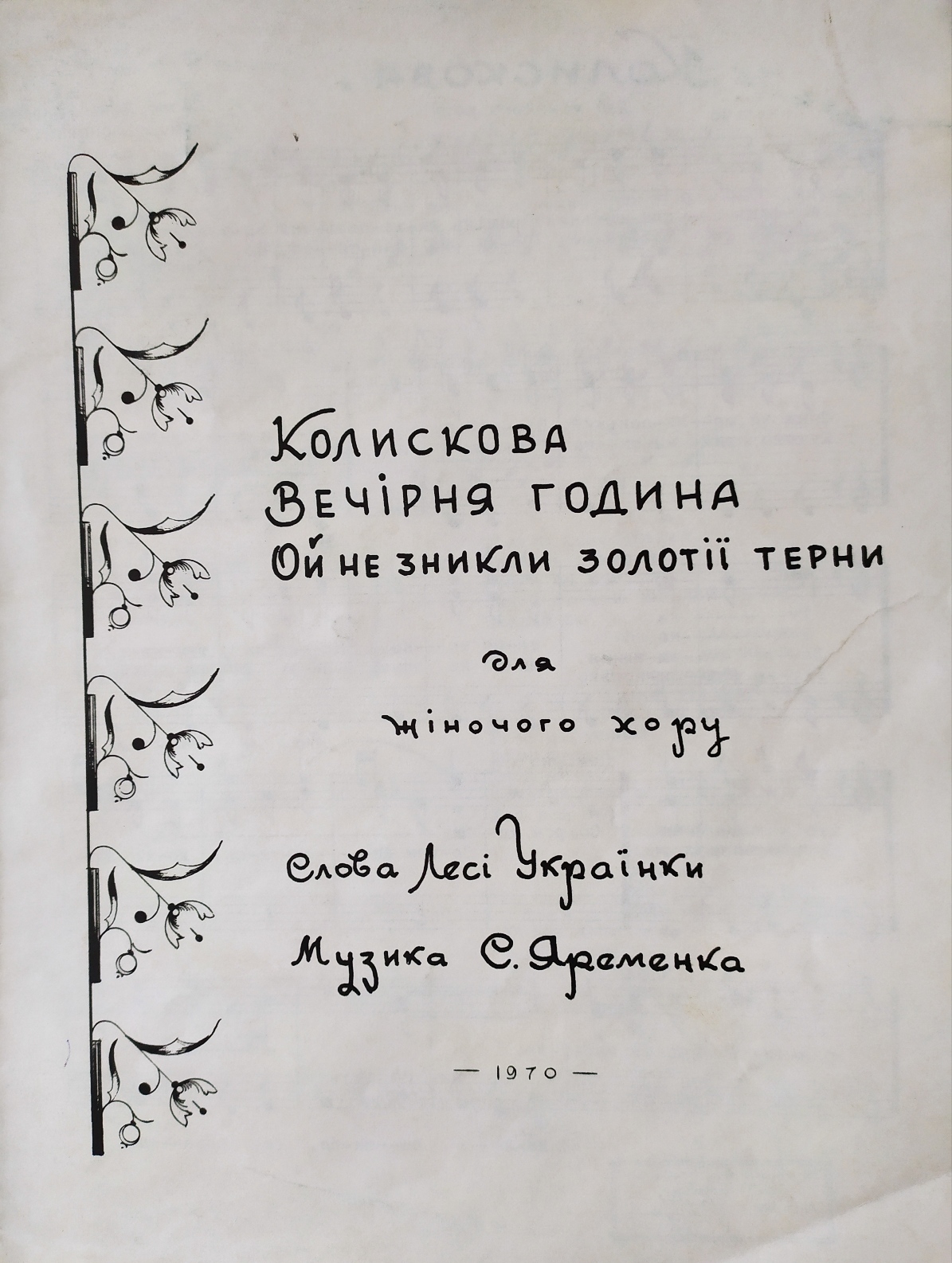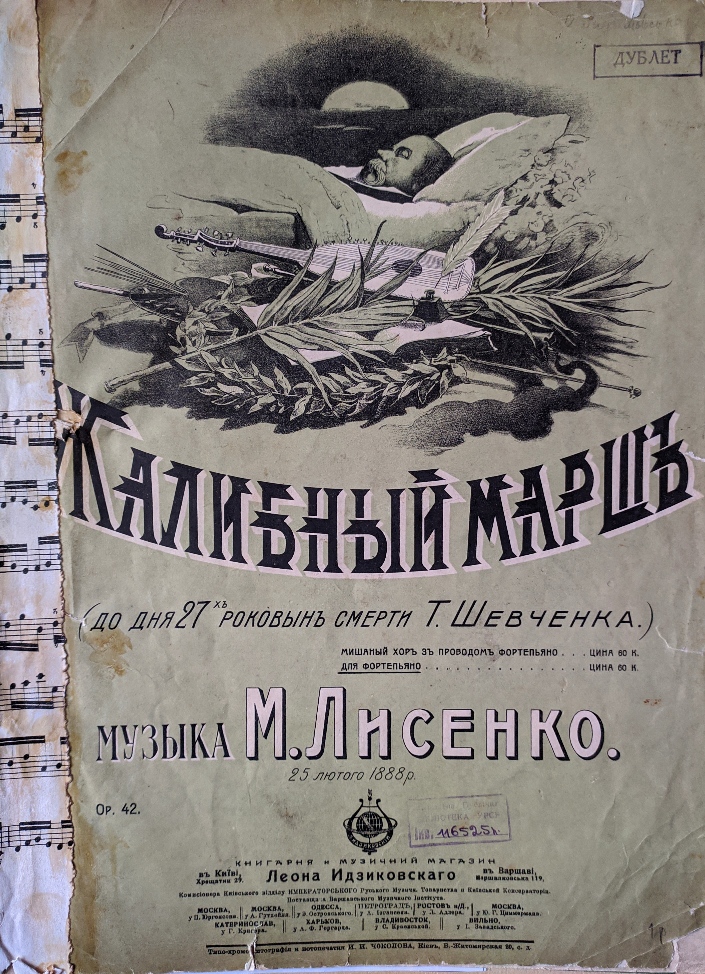 Цікавим досвідом для Лесі Українки стала співпраця з Миколою Лисенком над «Жалібним маршем: до дня 27-х роковин смерті Т. Шевченка» (25 лютого 1888 р.). (Іл. № 6). Як відомо, композитор спочатку створив фортепіанний твір, але потім звернувся до 17-річної поетеси з проханням написати слова, і вона з успіхом впоралася з цим завданням. Отже, Леся Українка інтерпретувала поетичним словом музику Миколи Лисенка. У відділі зберігаються декілька примірників цього хорового твору видання фірми Леона Ідзіковського, а також видання «Жалібного маршу» у первинній – фортепіанній версії.