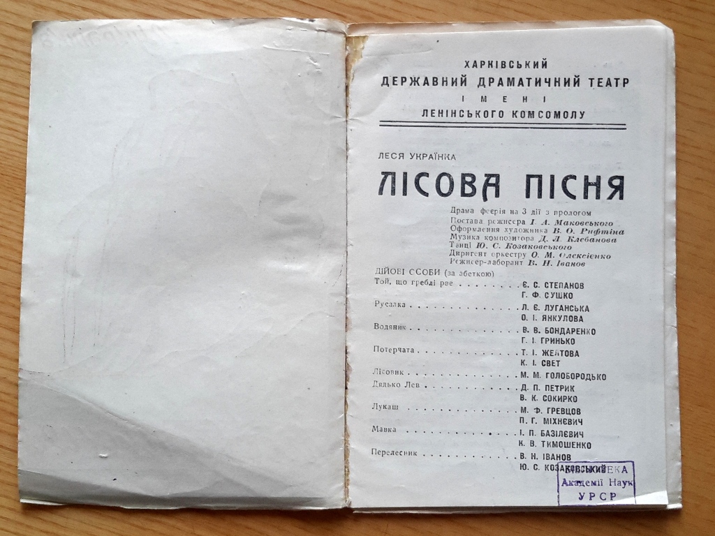Музику до драматичних спектаклів за мотивами твору Лесі Українки «Лісова пісня» писали Ірина Губаренко, Дмитро Клебанов (Іл. №№ 17–18), Геннадій Фролов, Юрій Шевченко. Клавіри автографів творів І. Губаренко та Ю. Шевченка (Іл. №№ 19) зберігаються у колекції «Музичний Фонд України».