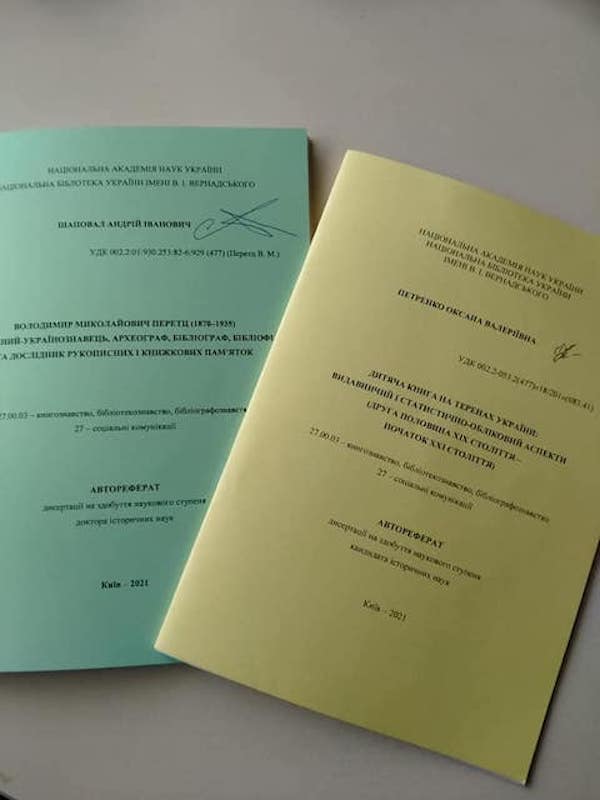 26 квітня в Національній бібліотеці України імені В.І. Вернадського відбулися захисти дисертацій: докторської Андрія Івановича Шаповала на тему "Володимир Миколайович Перетц (1870-1935) як вчений-українознавець, археограф, бібліограф, бібліофіл та дослідник рукописних і книжкових пам'яток", а також кандидатської Оксани Валеріївни Петренко – "Дитяча книга на теренах України: видавничий і статистично-обліковий аспекти (друга половина ХІХ ст. – початок ХХІ ст.)".