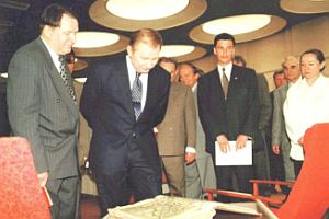 14 травня 1998 року. Генеральний директор Національної бібліотеки України імені В. І. Вернадського Олексій Онищенко (крайній зліва) знайомить Президента України Леоніда Кучму з раритетами Бібліотеки.