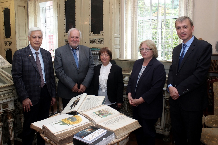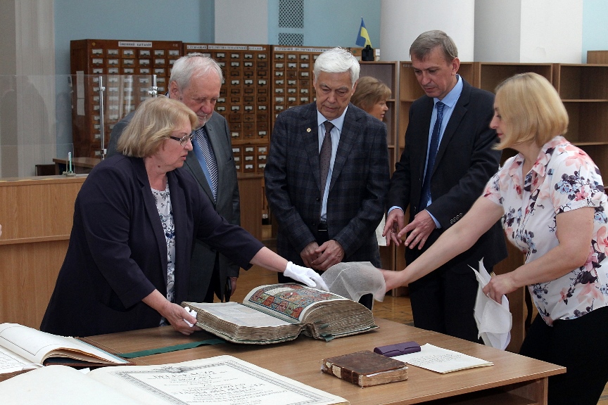 У відділі стародруків та рідкісних видань Інституту книгознавства старший науковий співробітник І. О. Римарович розповіла про історію підрозділу, виставку найбільш цікавих стародруків, що зберігаються у фондах Бібліотеки, коротко проінформувала про цінні книжки польського походження. Бібліотечна колекція інкунабул була представлена виданнями праць Аристотеля «Життя тварин», надрукованій на пергаменті, та Г. Лебедя «Всесвітньою хронікою» (1493) Г. Шеделя. Остання має дарчий напис бібліофіла І. Скімбаровича тодішньому власнику Вишневецького замку, теж бібліофілу В. Плятеру де Броелю. Бібліотечну колекцію палеотипів представляв примірник аугсбурзького видання поетичного твору М. Пфінцинга «Небезпечні пригоди достойного, хороброго і знаменитого героя і рицаря Тоєрданка» (1519), створеного за розпорядженням імператора Максиміліана І. У ньому змальовується його подорож до нареченої Марії Бургундської. Інтерес викликали стародруки полоністичної тематики: видання юридичних документів та історичних праць М. Бєльського «Хроніка всього світу» (1554), С. Сарницького «Статути і метрика коронних привілеїв…» (1594), А. Гваньїні «Хроніка Європейської Сарматії» (1611), Й. Пасторія «Історія Польщі» (1641), «Саксонське право» (1581) у перекладі польською мовою та друком писаря ради Львова П. Щербича. Унікальний дарчий запис має примірник віденського видання поеми С. Трембецького «Софіївка» (1815), присвячений Софії Потоцькій. Книжку подарував київському митрополиту Є. Болховитінову предводитель дворянства Київської губернії граф Г. Олізар. Багато ілюстровані атласи і видання ботанічної тематики: Г. Браун «Міста світу» (1577), Л. Фукс «Про історію рослин» (1542) і В. Вейман «Іконографія рослин» (1715) тощо. На виставці також було представлено стародруки з суперекслібрисами польських королів Сигізмунда ІІ Августа і Станіслава-Августа Понятовського та суперекслібрисом князя Михайла-Серватія Вишневецького. Пана президента було ознайомлено з результатами багаторічної співпраці українських і польських книгознавців.