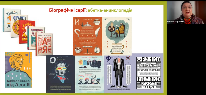 Старша наукова співробітниця, кандидат історичних наук Наталя Петрівна Марченко в доповіді «Особливості біографічних реконструкцій у сучасних українських виданнях для дітей і юнацтва» означила основні відмінності між біографічними виданнями для дітей і загальною біографічною літературою, як от подвійна адресація та вікові особливості сприйняття читача, різниця між біографічним дискурсом минулого та сьогоденням тощо. Також вона проаналізувала типологічні риси та тематичні різновиди видань для дітей періоду російсько-української війни.