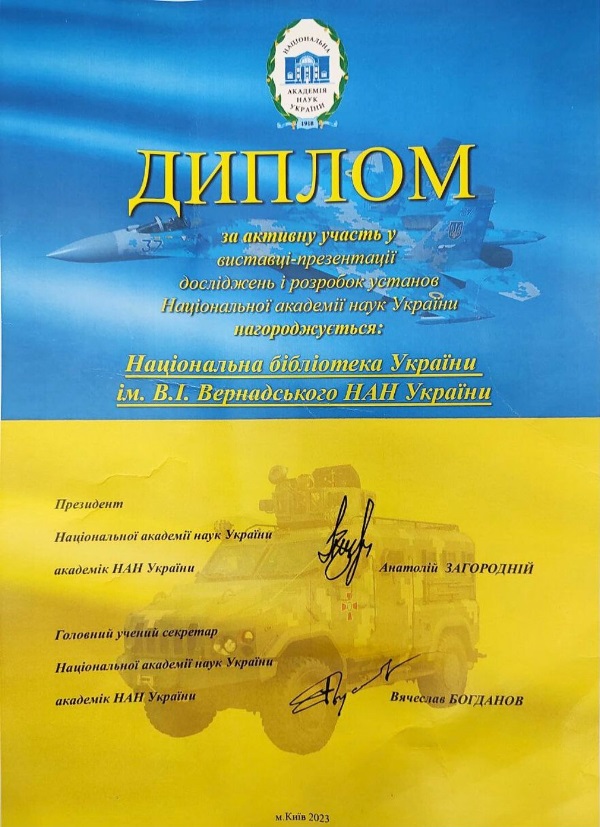 Днями Національна бібліотека імені В.І. Вернадського НАН України отримала підписаний президентом Національної академії наук України, академіка НАН України Анатолієм Загороднім диплом «За активну участь у виставці-презентації досліджень і розробок установ Національної академії наук України».