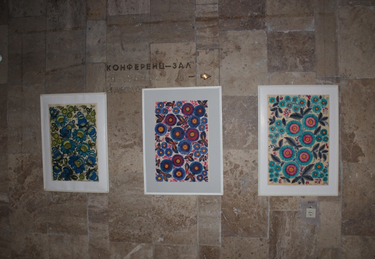 До нашої Бібліотеки експоновані роботи Петриківського розпису потрапили спершу як експонати такої ж виставки. На початку 90-х років минулого століття група майстрів Петриківки надала свої твори, аби з ними ознайомились відвідувачі НБУВ, потім з різних причин довго не могли їх забрати, зрештою вирішили – нехай залишаються в Бібліотеці, тут їх побачить більше людей. Так ми стали володарями безцінних скарбів – робіт народних майстрів Петриківського розпису.